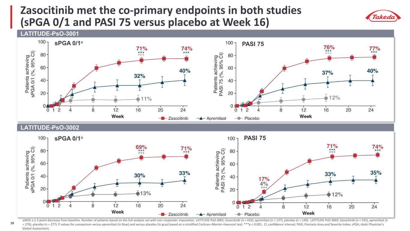 Baseline demographics and characteristics were generally similar across treatment arms in each study 9 LATITUDE-PsO-3001 LATITUDE-PsO-3002 Zasocitinib (n = 416) Apremilast (n = 137) Placebo (n = 140) Zasocitinib (n = 555) Apremilast (n = 276) Placebo (n = 277) Age, years 43.8 (13.26) 46.0 (14.10) 45.3 (13.54) 45.8 (13.33) 46.1 (13.37) 46.5 (13.19) Sex, male, n (%) 295 (70.9) 95 (69.3) 93 (66.4) 367 (66.1) 187 (67.8) 188 (67.9) Race, White, n (%) 255 (61.3) 88 (64.2) 87 (62.1) 472 (85.0) 233 (84.4) 240 (86.6) BMI, kg/m2 29.7 (6.8) 28.5 (6.3) 28.2 (6.5) 30.2 (6.8) 30.1 (6.5) 30.4 (7.2) Psoriasis duration, median (range) yearsa 13.6 (0.6–62.4) 14.0 (0.6–71.3) 12.5 (0.6–59.3) 15.1 (0.5–69.2) 16.5 (0.6–60.5) 15.1 (0.6–65.9) PASI score 19.7 (7.5) 20.5 (9.0) 20.3 (7.4) 21.3 (9.3) 21.4 (8.6) 21.1 (8.5) sPGA score 3 (moderate), n (%) 329 (79.1) 116 (84.7) 112 (80.0) 473 (85.2) 237 (85.9) 228 (82.3) 4 (severe), n (%) 85 (20.4) 21 (15.3) 28 (20.0) 80 (14.4) 39 (14.1) 48 (17.3) BSA, % 24.0 (14.0) 25.8 (15.9) 24.2 (14.4) 27.9 (17.9) 27.8 (16.5) 27.0 (16.3) DLQI scoreb 12.7 (7.2) 11.1 (6.5) 12.2 (7.3) 11.6 (7.2) 11.5 (6.7) 12.2 (7.4) Bio-experienced, n (%) 141 (33.9) 40 (29.2) 45 (32.1) 155 (27.9) 80 (29.0) 83 (30.0) Data are mean (SD) unless otherwise stated. aData missing for one patient receiving zasocitinib (LATITUDE-PsO-3002). bData missing for three patients receiving zasocitinib and one receiving apremilast (LATITUDE-PsO-3001), and for three patients receiving zasocitinib, one patient receiving apremilast, and four patients receiving placebo (LATITUDE-PsO-3002). BMI, body mass index; BSA, body surface area; DLQI, Dermatology Life Quality Index; PASI, Psoriasis Area and Severity Index; SD, standard deviation; sPGA, static Physician’s Global Assessment.