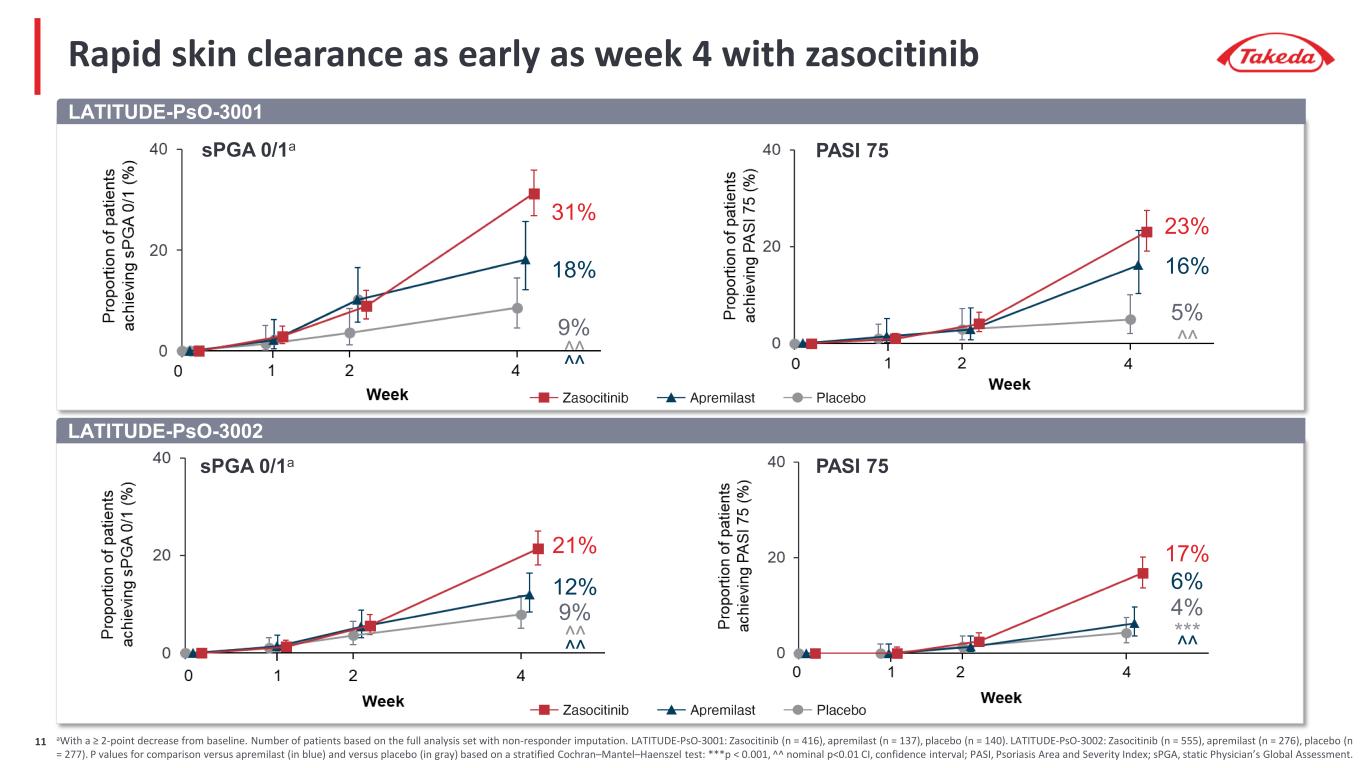 LATITUDE-PsO-3002 Zasocitinib met the co-primary endpoints in both studies (sPGA 0/1 and PASI 75 versus placebo at Week 16) 10 PASI 75sPGA 0/1a PASI 75sPGA 0/1a aWith a ≥ 2-point decrease from baseline. Number of patients based on the full analysis set with non-responder imputation. LATITUDE-PsO-3001: Zasocitinib (n = 416), apremilast (n = 137), placebo (n = 140). LATITUDE-PsO-3002: Zasocitinib (n = 555), apremilast (n = 276), placebo (n = 277). P values for comparison versus apremilast (in blue) and versus placebo (in gray) based on a stratified Cochran–Mantel–Haenszel test: ***p < 0.001. CI, confidence interval; PASI, Psoriasis Area and Severity Index; sPGA, static Physician’s Global Assessment. LATITUDE-PsO-3001