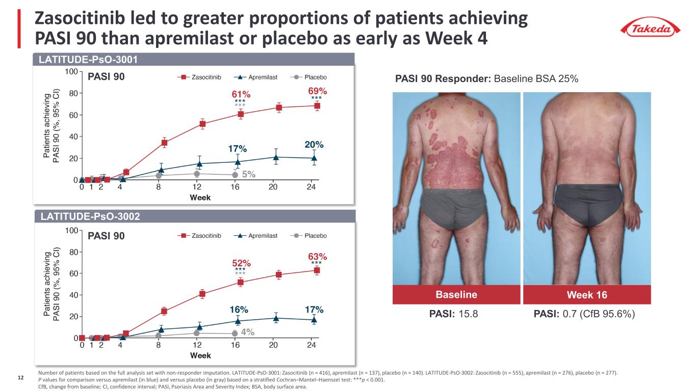 LATITUDE-PsO-3002 LATITUDE-PsO-3001 Rapid skin clearance as early as week 4 with zasocitinib 11 PASI 75 PASI 75sPGA 0/1a aWith a ≥ 2-point decrease from baseline. Number of patients based on the full analysis set with non-responder imputation. LATITUDE-PsO-3001: Zasocitinib (n = 416), apremilast (n = 137), placebo (n = 140). LATITUDE-PsO-3002: Zasocitinib (n = 555), apremilast (n = 276), placebo (n = 277). P values for comparison versus apremilast (in blue) and versus placebo (in gray) based on a stratified Cochran–Mantel–Haenszel test: ***p < 0.001, ̂ ^ nominal p<0.01 CI, confidence interval; PASI, Psoriasis Area and Severity Index; sPGA, static Physician’s Global Assessment. *** 17% 6% 4% ^^ 23% 16% 5% ^^ 21% 12% 9% ^^^^ sPGA 0/1a 31% 18% 9% ^^^^