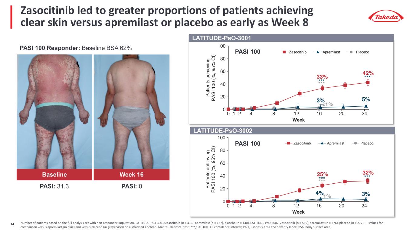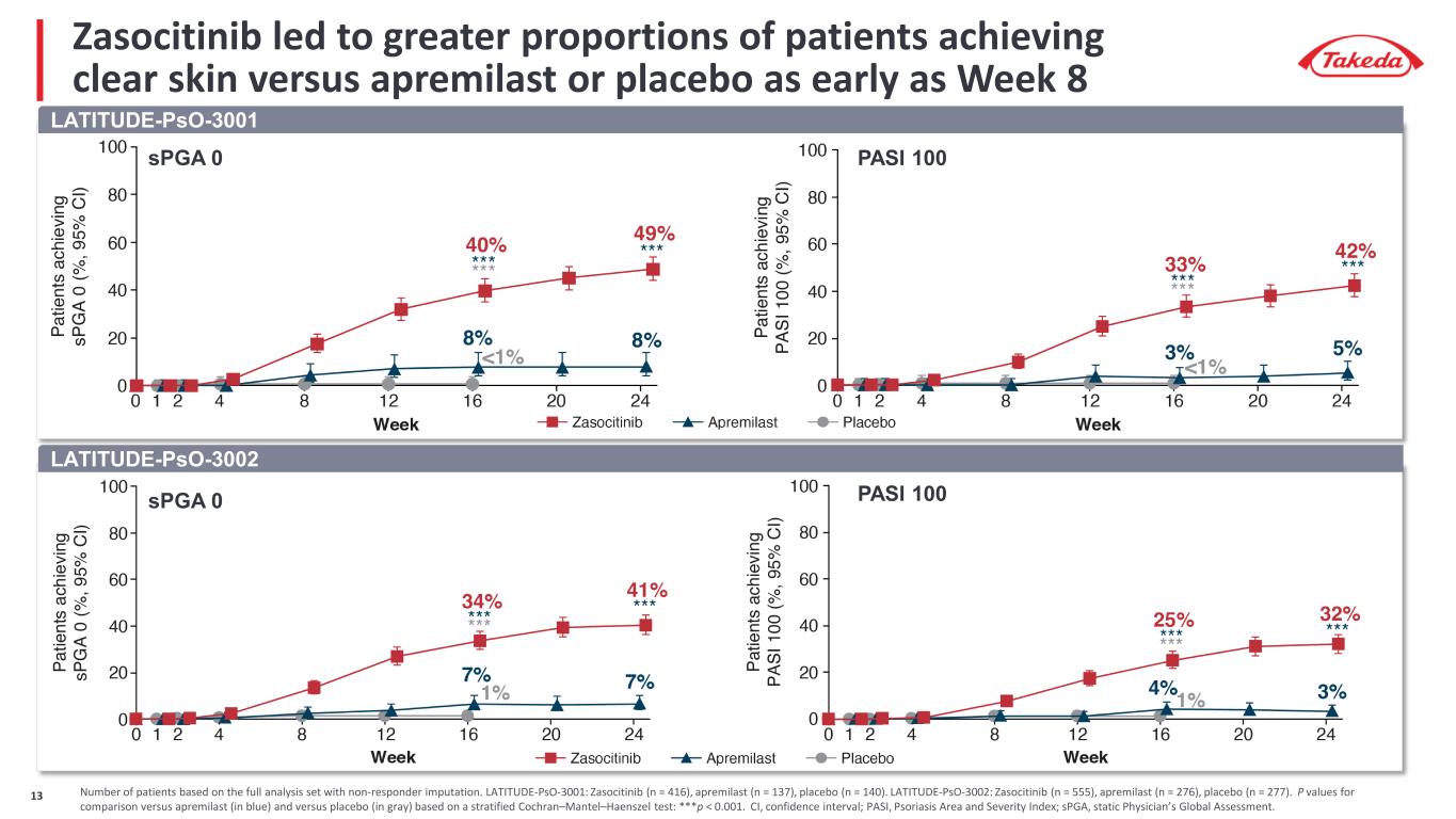 Zasocitinib led to greater proportions of patients achieving clear skin versus apremilast or placebo as early as Week 8 13 sPGA 0 sPGA 0 PASI 100 PASI 100 Number of patients based on the full analysis set with non-responder imputation. LATITUDE-PsO-3001: Zasocitinib (n = 416), apremilast (n = 137), placebo (n = 140). LATITUDE-PsO-3002: Zasocitinib (n = 555), apremilast (n = 276), placebo (n = 277). P values for comparison versus apremilast (in blue) and versus placebo (in gray) based on a stratified Cochran–Mantel–Haenszel test: ***p < 0.001. CI, confidence interval; PASI, Psoriasis Area and Severity Index; sPGA, static Physician’s Global Assessment. LATITUDE-PsO-3002 LATITUDE-PsO-3001