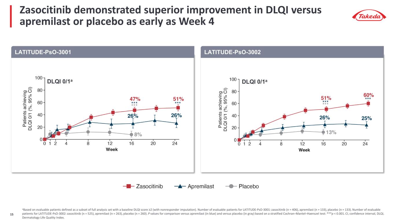 Zasocitinib demonstrated superior improvement in DLQI versus apremilast or placebo as early as Week 4 15 LATITUDE-PsO-3002LATITUDE-PsO-3001 DLQI 0/1a DLQI 0/1a aBased on evaluable patients defined as a subset of full analysis set with a baseline DLQI score ≥2 (with nonresponder imputation). Number of evaluable patients for LATITUDE-PsO-3001: zasocitinib (n = 406), apremilast (n = 133), placebo (n = 133). Number of evaluable patients for LATITUDE-PsO-3002: zasocitinib (n = 525), apremilast (n = 263), placebo (n = 260). P values for comparison versus apremilast (in blue) and versus placebo (in gray) based on a stratified Cochran–Mantel–Haenszel test: ***p < 0.001. CI, confidence interval, DLQI, Dermatology Life Quality Index.