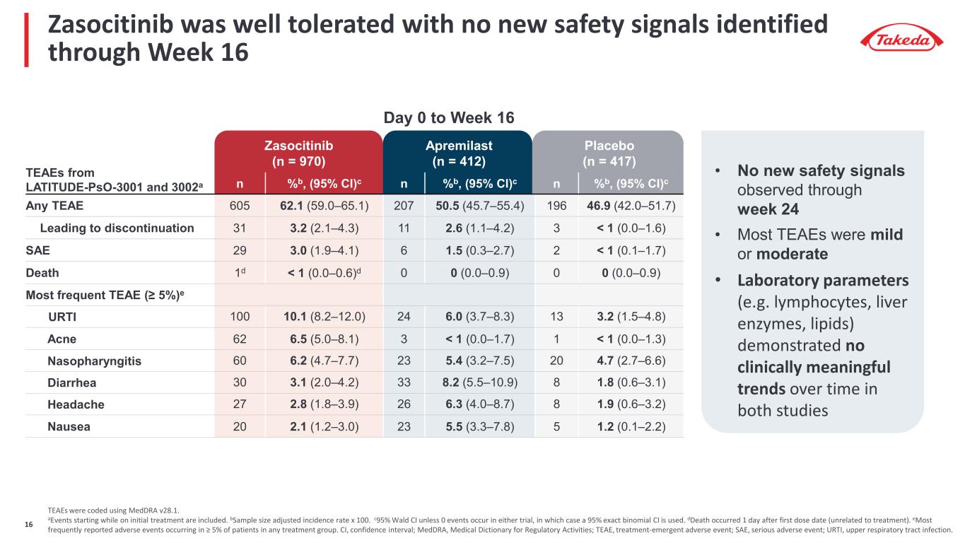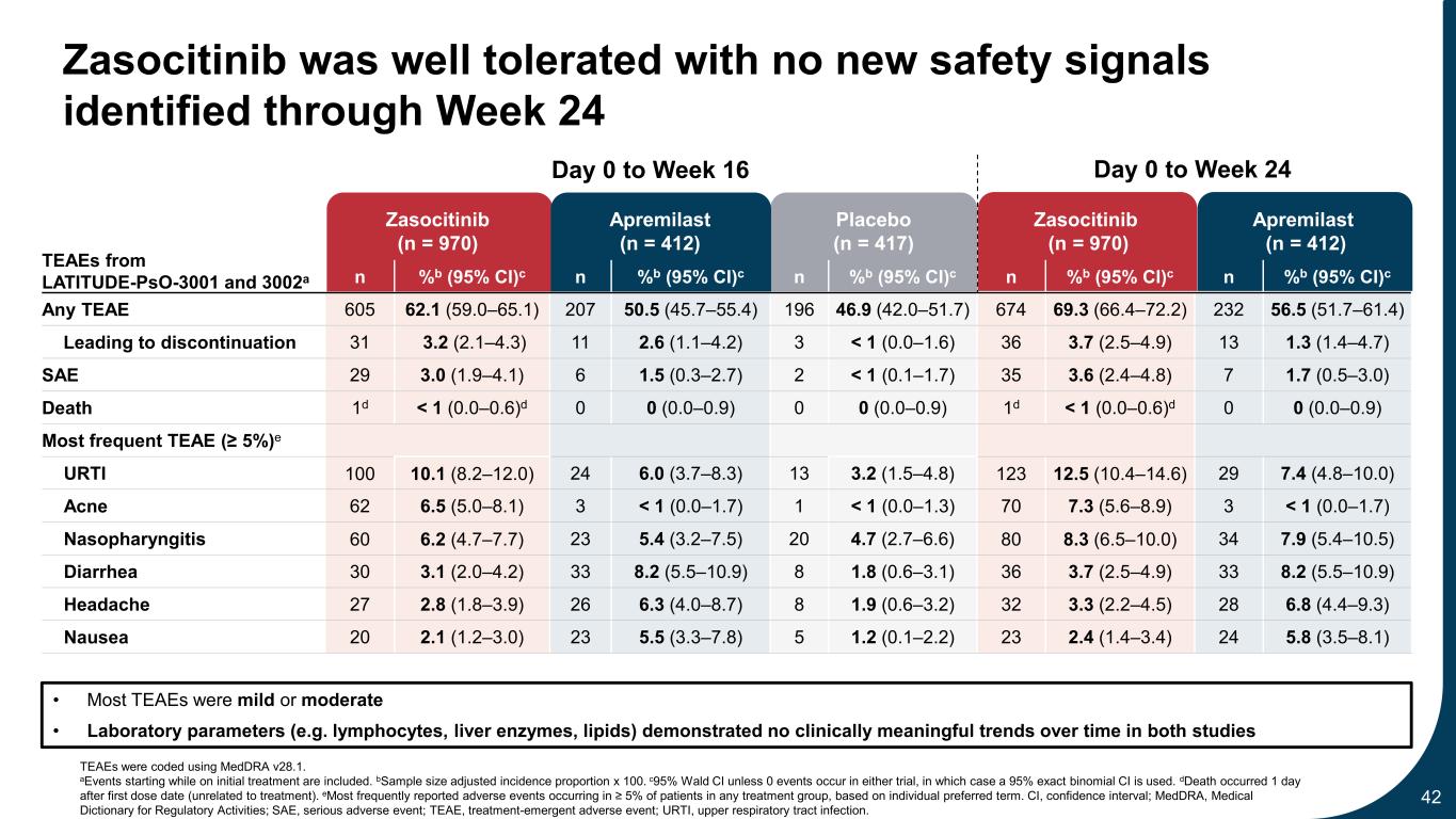 Zasocitinib was well tolerated with no new safety signals identified through Week 16 16 Day 0 to Week 16 TEAEs from LATITUDE-PsO-3001 and 3002a Zasocitinib (n = 970) Apremilast (n = 412) Placebo (n = 417) n %b, (95% CI)c n %b, (95% CI)c n %b, (95% CI)c Any TEAE 605 62.1 (59.0–65.1) 207​ 50.5 (45.7–55.4) 196​ 46.9 (42.0–51.7) Leading to discontinuation 31 3.2 (2.1–4.3)​ 11​ 2.6 (1.1–4.2) 3​ < 1 (0.0–1.6) SAE 29 3.0 (1.9–4.1) 6​ 1.5 (0.3–2.7) 2​ < 1 (0.1–1.7) Death 1d < 1 (0.0–0.6)d 0​ 0 (0.0–0.9)​ 0​ 0 (0.0–0.9)​ Most frequent TEAE (≥ 5%)e URTI 100 10.1 (8.2–12.0) 24​ 6.0 (3.7–8.3) 13​ 3.2 (1.5–4.8) Acne​ 62​ 6.5 (5.0–8.1) 3​ < 1 (0.0–1.7) 1​ < 1 (0.0–1.3) Nasopharyngitis​ 60 6.2 (4.7–7.7) 23​ 5.4 (3.2–7.5) 20​ 4.7 (2.7–6.6) Diarrhea​ 30​ 3.1 (2.0–4.2) 33​ 8.2 (5.5–10.9) 8​ 1.8 (0.6–3.1) Headache​ 27​ 2.8 (1.8–3.9) 26​ 6.3 (4.0–8.7) 8​ 1.9 (0.6–3.2) Nausea​ 20​ 2.1 (1.2–3.0) 23​ 5.5 (3.3–7.8) 5​ 1.2 (0.1–2.2) • No new safety signals observed through week 24 • Most TEAEs were mild or moderate • Laboratory parameters (e.g. lymphocytes, liver enzymes, lipids) demonstrated no clinically meaningful trends over time in both studies​ TEAEs were coded using MedDRA v28.1. aEvents starting while on initial treatment are included. bSample size adjusted incidence rate x 100. c95% Wald CI unless 0 events occur in either trial, in which case a 95% exact binomial CI is used. dDeath occurred 1 day after first dose date (unrelated to treatment). eMost frequently reported adverse events occurring in ≥ 5% of patients in any treatment group. CI, confidence interval; MedDRA, Medical Dictionary for Regulatory Activities; TEAE, treatment-emergent adverse event; SAE, serious adverse event; URTI, upper respiratory tract infection.