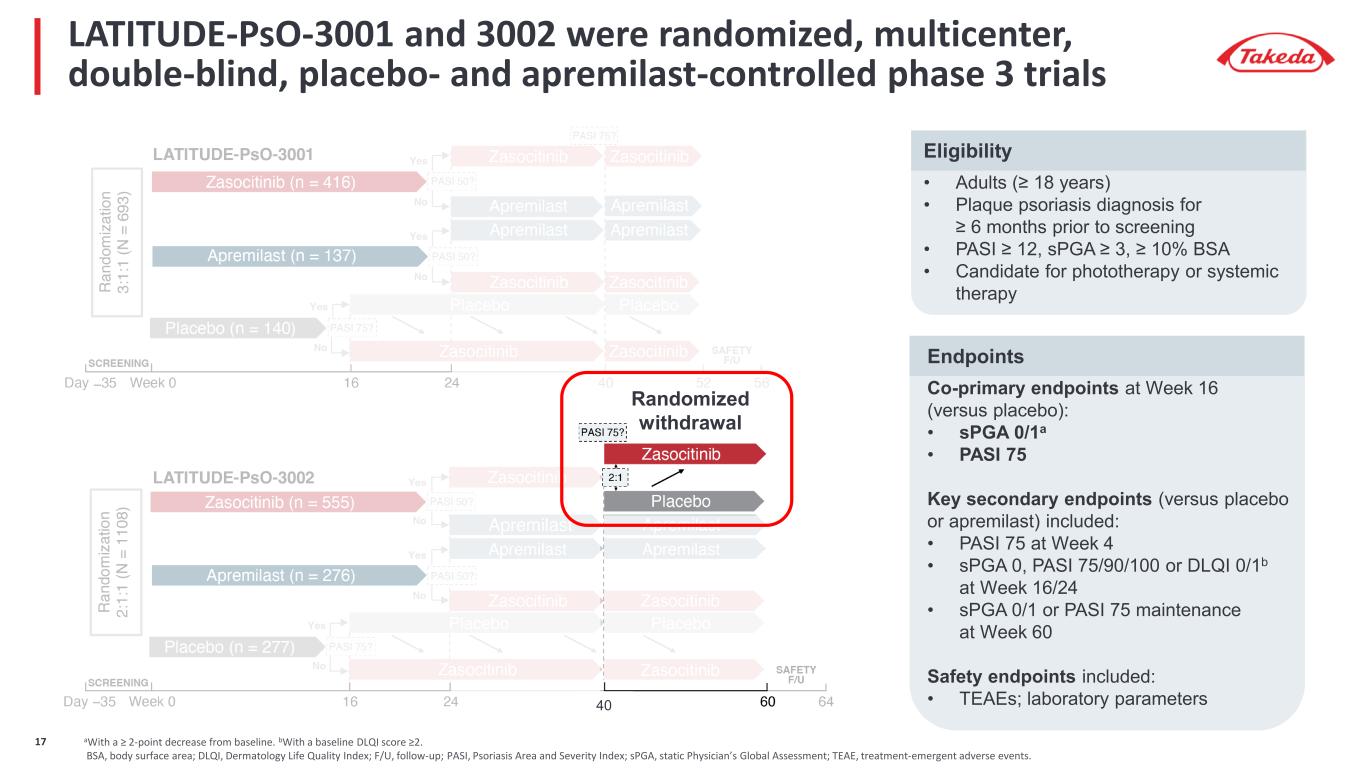 33aWith a ≥ 2-point decrease from baseline. bWith a baseline DLQI score ≥2. BSA, body surface area; DLQI, Dermatology Life Quality Index; F/U, follow-up; PASI, Psoriasis Area and Severity Index; sPGA, static Physician’s Global Assessment; TEAE, treatment-emergent adverse events. Eligibility • Adults (≥ 18 years) • Plaque psoriasis diagnosis for ≥ 6 months prior to screening • PASI ≥ 12, sPGA ≥ 3, ≥ 10% BSA • Candidate for phototherapy or systemic therapy Endpoints Co-primary endpoints at Week 16 (versus placebo): • sPGA 0/1a • PASI 75 Key secondary endpoints (versus placebo or apremilast) included: • PASI 75 at Week 4 • sPGA 0, PASI 75/90/100 or DLQI 0/1b at Week 16 or 24 • sPGA 0/1 or PASI 75 maintenance at Week 60 Safety endpoints included: • TEAEs; laboratory parameters LATITUDE-PsO-3001 and 3002 were randomized, multicenter, double-blind, placebo- and apremilast-controlled phase 3 trials