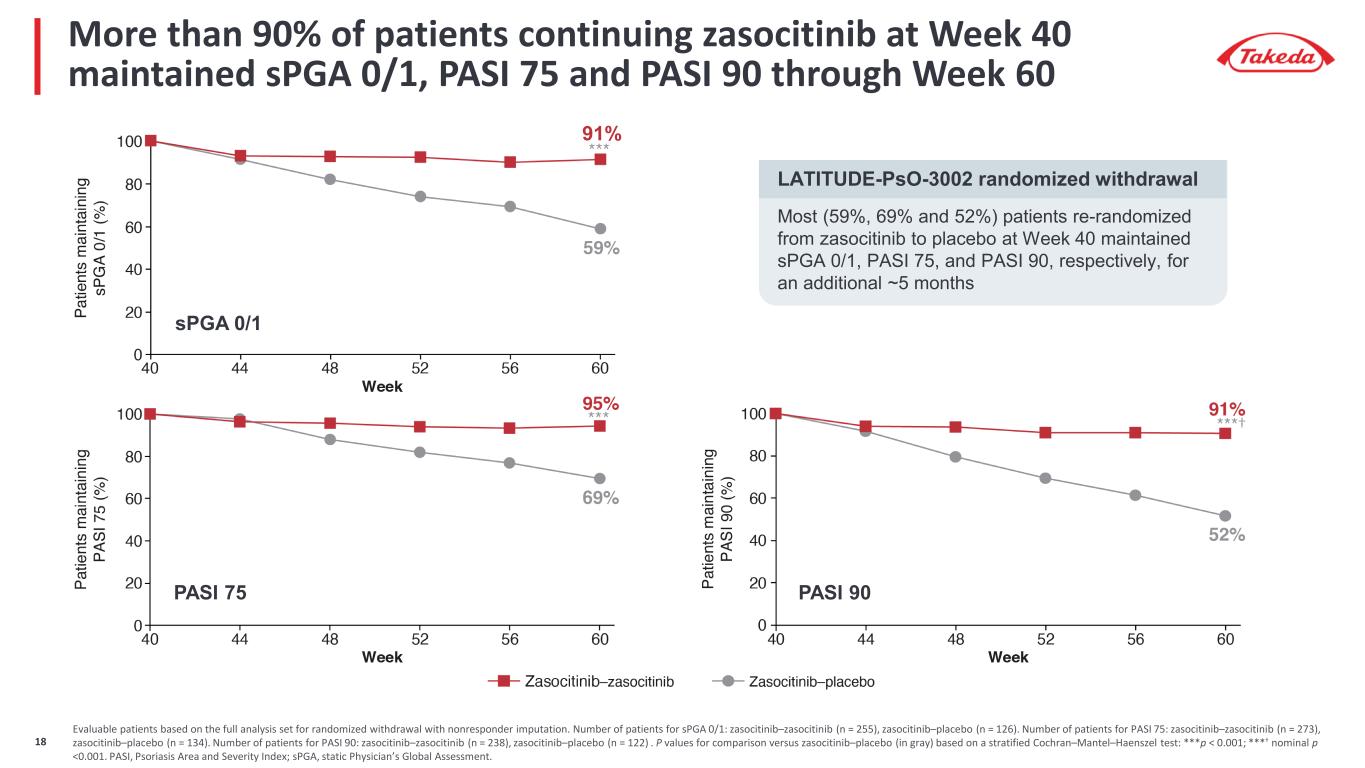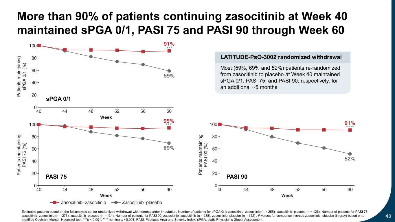 43 More than 90% of patients continuing zasocitinib at Week 40 maintained sPGA 0/1, PASI 75 and PASI 90 through Week 60 sPGA 0/1 PASI 75 Evaluable patients based on the full analysis set for randomized withdrawal with nonresponder imputation. Number of patients for sPGA 0/1: zasocitinib–zasocitinib (n = 255), zasocitinib–placebo (n = 126). Number of patients for PASI 75: zasocitinib–zasocitinib (n = 273), zasocitinib–placebo (n = 134). Number of patients for PASI 90: zasocitinib–zasocitinib (n = 238), zasocitinib–placebo (n = 122) . P values for comparison versus zasocitinib–placebo (in gray) based on a stratified Cochran–Mantel–Haenszel test: ***p < 0.001; ***† nominal p <0.001. PASI, Psoriasis Area and Severity Index; sPGA, static Physician’s Global Assessment. LATITUDE-PsO-3002 randomized withdrawal Most (59%, 69% and 52%) patients re-randomized from zasocitinib to placebo at Week 40 maintained sPGA 0/1, PASI 75, and PASI 90, respectively, for an additional ~5 months PASI 90