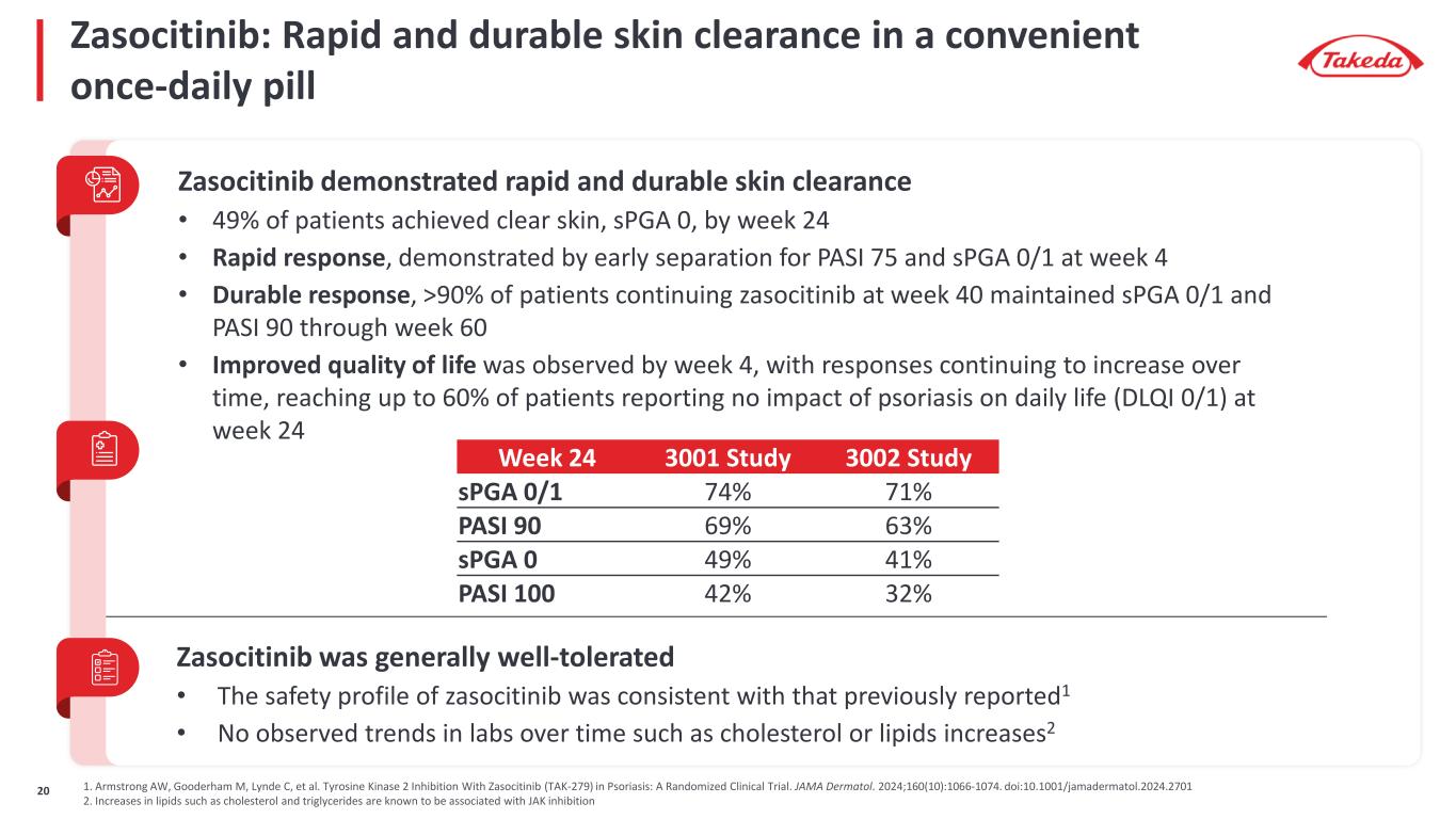 Zasocitinib was generally well-tolerated • The safety profile of zasocitinib was consistent with that previously reported1 • No observed trends in labs over time such as cholesterol or lipids increases2 20 Week 24 3001 Study 3002 Study sPGA 0/1 74% 71% PASI 90 69% 63% sPGA 0 49% 41% PASI 100 42% 32% 1. Armstrong AW, Gooderham M, Lynde C, et al. Tyrosine Kinase 2 Inhibition With Zasocitinib (TAK-279) in Psoriasis: A Randomized Clinical Trial. JAMA Dermatol. 2024;160(10):1066-1074. doi:10.1001/jamadermatol.2024.2701 2. Increases in lipids such as cholesterol and triglycerides are known to be associated with JAK inhibition Zasocitinib: Rapid and durable skin clearance in a convenient once-daily pill Zasocitinib demonstrated rapid and durable skin clearance • 49% of patients achieved clear skin, sPGA 0, by week 24 • Rapid response, demonstrated by early separation for PASI 75 and sPGA 0/1 at week 4 • Durable response, >90% of patients continuing zasocitinib at week 40 maintained sPGA 0/1 and PASI 90 through week 60 • Improved quality of life was observed by week 4, with responses continuing to increase over time, reaching up to 60% of patients reporting no impact of psoriasis on daily life (DLQI 0/1) at week 24