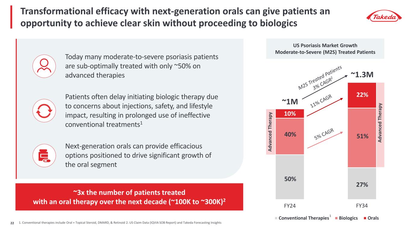 22 Conventional Therapies Biologics Orals ~1M ~1.3M 27% 40% 51% 10% 22% 1. Conventional therapies include Oral + Topical Steroid​, DMARD, & Retinoid 2. US Claim Data (IQVIA SOB Report) and Takeda Forecasting Insights Ad va nc ed T he ra py Ad va nc ed T he ra py 50% FY24 FY34 ~3x the number of patients treated with an oral therapy over the next decade (~100K to ~300K)2 Transformational efficacy with next-generation orals can give patients an opportunity to achieve clear skin without proceeding to biologics Today many moderate-to-severe psoriasis patients are sub-optimally treated with only ~50% on advanced therapies Patients often delay initiating biologic therapy due to concerns about injections, safety, and lifestyle impact, resulting in prolonged use of ineffective conventional treatments1 Next-generation orals can provide efficacious options positioned to drive significant growth of the oral segment US Psoriasis Market Growth Moderate-to-Severe (M2S) Treated Patients 1
