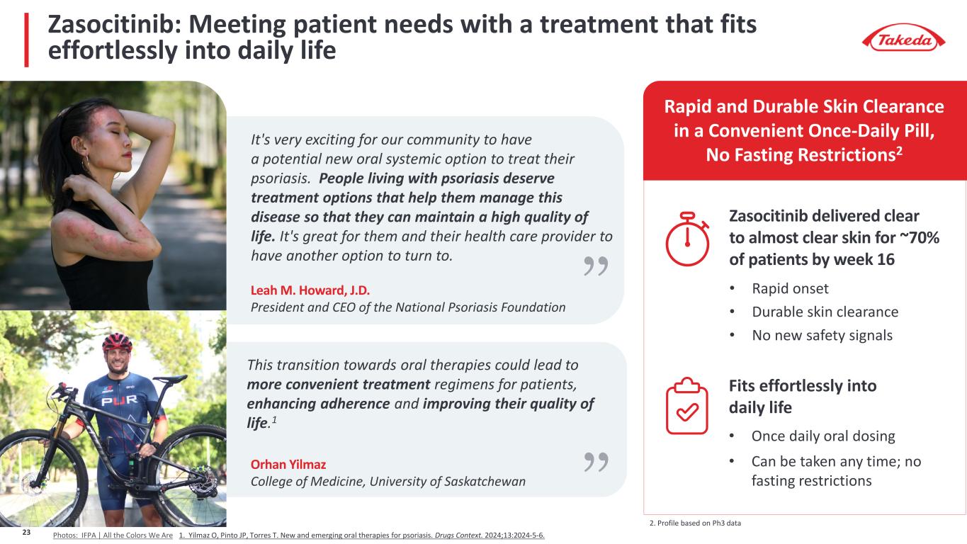 Zasocitinib: Meeting patient needs with a treatment that fits effortlessly into daily life 2. Profile based on Ph3 data Rapid and Durable Skin Clearance in a Convenient Once-Daily Pill, No Fasting Restrictions2 Zasocitinib delivered clear to almost clear skin for ~70% of patients by week 16 • Rapid onset • Durable skin clearance • No new safety signals Fits effortlessly into daily life • Once daily oral dosing • Can be taken any time; no fasting restrictions 23 Photos: IFPA | All the Colors We Are It's very exciting for our community to have a potential new oral systemic option to treat their psoriasis. People living with psoriasis deserve treatment options that help them manage this disease so that they can maintain a high quality of life. It's great for them and their health care provider to have another option to turn to. Leah M. Howard, J.D. President and CEO of the National Psoriasis Foundation ” 1. Yilmaz O, Pinto JP, Torres T. New and emerging oral therapies for psoriasis. Drugs Context. 2024;13:2024-5-6. This transition towards oral therapies could lead to more convenient treatment regimens for patients, enhancing adherence and improving their quality of life.1 Orhan Yilmaz College of Medicine, University of Saskatchewan ”