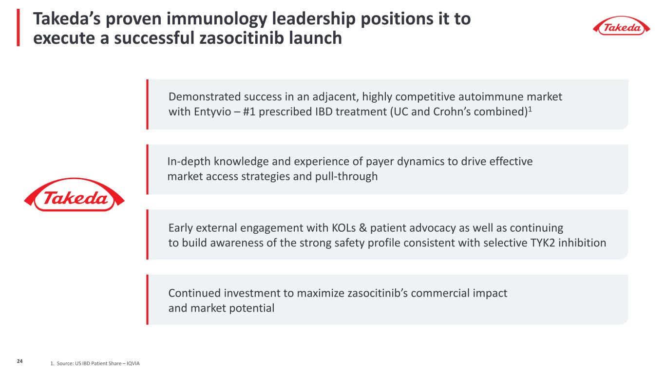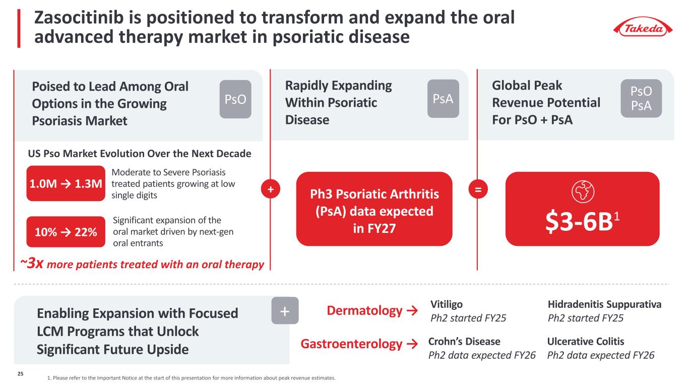 24 Continued investment to maximize zasocitinib’s commercial impact and market potential Demonstrated success in an adjacent, highly competitive autoimmune market with Entyvio – #1 prescribed IBD treatment (UC and Crohn’s combined)1 In-depth knowledge and experience of payer dynamics to drive effective market access strategies and pull-through Early external engagement with KOLs & patient advocacy as well as continuing to build awareness of the strong safety profile consistent with selective TYK2 inhibition 1. Source: US IBD Patient Share – IQVIA Takeda’s proven immunology leadership positions it to execute a successful zasocitinib launch