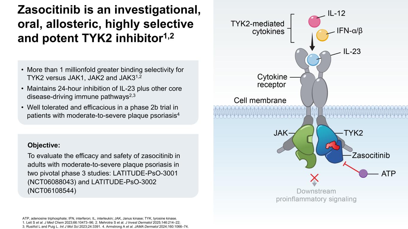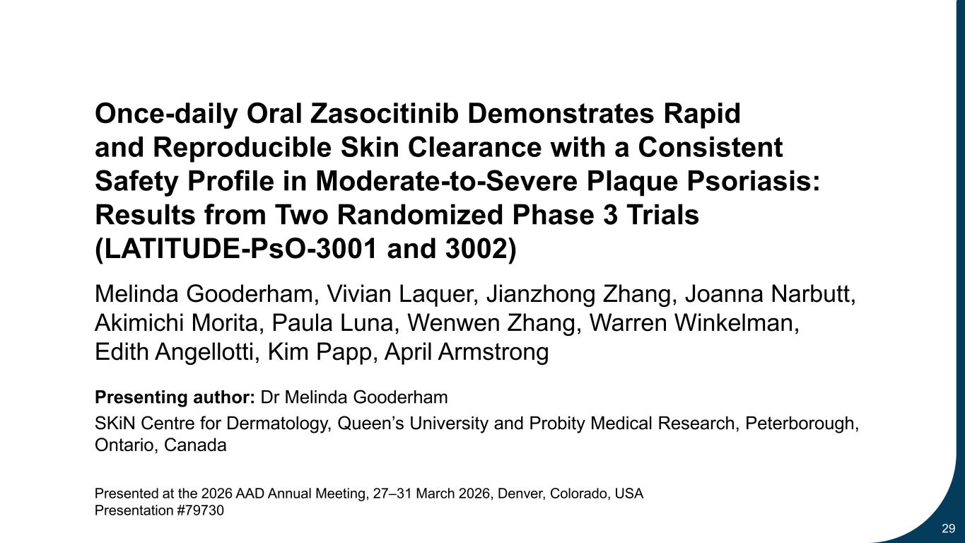 29 Once-daily Oral Zasocitinib Demonstrates Rapid and Reproducible Skin Clearance with a Consistent Safety Profile in Moderate-to-Severe Plaque Psoriasis: Results from Two Randomized Phase 3 Trials (LATITUDE-PsO-3001 and 3002) Melinda Gooderham, Vivian Laquer, Jianzhong Zhang, Joanna Narbutt, Akimichi Morita, Paula Luna, Wenwen Zhang, Warren Winkelman, Edith Angellotti, Kim Papp, April Armstrong Presenting author: Dr Melinda Gooderham SKiN Centre for Dermatology, Queen’s University and Probity Medical Research, Peterborough, Ontario, Canada Presented at the 2026 AAD Annual Meeting, 27–31 March 2026, Denver, Colorado, USA Presentation #79730