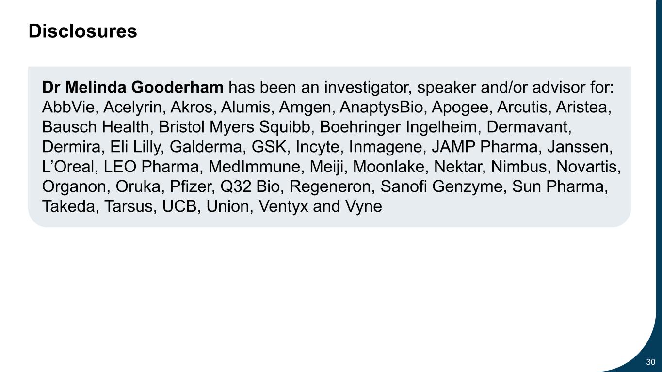 30 Disclosures Dr Melinda Gooderham has been an investigator, speaker and/or advisor for: AbbVie, Acelyrin, Akros, Alumis, Amgen, AnaptysBio, Apogee, Arcutis, Aristea, Bausch Health, Bristol Myers Squibb, Boehringer Ingelheim, Dermavant, Dermira, Eli Lilly, Galderma, GSK, Incyte, Inmagene, JAMP Pharma, Janssen, L’Oreal, LEO Pharma, MedImmune, Meiji, Moonlake, Nektar, Nimbus, Novartis, Organon, Oruka, Pfizer, Q32 Bio, Regeneron, Sanofi Genzyme, Sun Pharma, Takeda, Tarsus, UCB, Union, Ventyx and Vyne