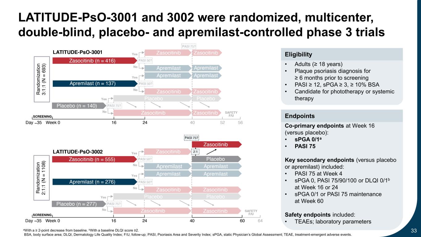 32 LATITUDE-PsO-3001 and 3002 were randomized, multicenter, double-blind, placebo- and apremilast-controlled phase 3 trials Eligibility • Adults (≥ 18 years) • Plaque psoriasis diagnosis for ≥ 6 months prior to screening • PASI ≥ 12, sPGA ≥ 3, ≥ 10% BSA • Candidate for phototherapy or systemic therapy aWith a ≥ 2-point decrease from baseline. bWith a baseline DLQI score ≥2. BSA, body surface area; DLQI, Dermatology Life Quality Index; F/U, follow-up; PASI, Psoriasis Area and Severity Index; sPGA, static Physician’s Global Assessment; TEAE, treatment-emergent adverse events. Endpoints Co-primary endpoints at Week 16 (versus placebo): • sPGA 0/1a • PASI 75 Key secondary endpoints (versus placebo or apremilast) included: • PASI 75 at Week 4 • sPGA 0, PASI 75/90/100 or DLQI 0/1b at Week 16 or 24 • sPGA 0/1 or PASI 75 maintenance at Week 60 Safety endpoints included: • TEAEs; laboratory parameters