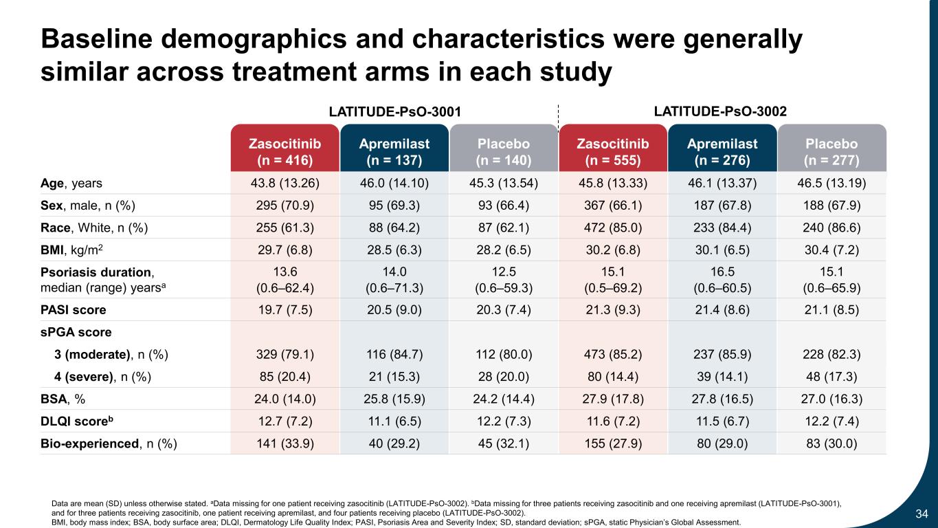 34 LATITUDE-PsO-3001 LATITUDE-PsO-3002 Baseline demographics and characteristics were generally similar across treatment arms in each study Data are mean (SD) unless otherwise stated. aData missing for one patient receiving zasocitinib (LATITUDE-PsO-3002). bData missing for three patients receiving zasocitinib and one receiving apremilast (LATITUDE-PsO-3001), and for three patients receiving zasocitinib, one patient receiving apremilast, and four patients receiving placebo (LATITUDE-PsO-3002). BMI, body mass index; BSA, body surface area; DLQI, Dermatology Life Quality Index; PASI, Psoriasis Area and Severity Index; SD, standard deviation; sPGA, static Physician’s Global Assessment. Zasocitinib (n = 416) Apremilast (n = 137) Placebo (n = 140) Zasocitinib (n = 555) Apremilast (n = 276) Placebo (n = 277) Age, years 43.8 (13.26) 46.0 (14.10) 45.3 (13.54) 45.8 (13.33) 46.1 (13.37) 46.5 (13.19) Sex, male, n (%) 295 (70.9) 95 (69.3) 93 (66.4) 367 (66.1) 187 (67.8) 188 (67.9) Race, White, n (%) 255 (61.3) 88 (64.2) 87 (62.1) 472 (85.0) 233 (84.4) 240 (86.6) BMI, kg/m2 29.7 (6.8) 28.5 (6.3) 28.2 (6.5) 30.2 (6.8) 30.1 (6.5) 30.4 (7.2) Psoriasis duration, median (range) yearsa 13.6 (0.6–62.4) 14.0 (0.6–71.3) 12.5 (0.6–59.3) 15.1 (0.5–69.2) 16.5 (0.6–60.5) 15.1 (0.6–65.9) PASI score 19.7 (7.5) 20.5 (9.0) 20.3 (7.4) 21.3 (9.3) 21.4 (8.6) 21.1 (8.5) sPGA score 3 (moderate), n (%) 329 (79.1) 116 (84.7) 112 (80.0) 473 (85.2) 237 (85.9) 228 (82.3) 4 (severe), n (%) 85 (20.4) 21 (15.3) 28 (20.0) 80 (14.4) 39 (14.1) 48 (17.3) BSA, % 24.0 (14.0) 25.8 (15.9) 24.2 (14.4) 27.9 (17.8) 27.8 (16.5) 27.0 (16.3) DLQI scoreb 12.7 (7.2) 11.1 (6.5) 12.2 (7.3) 11.6 (7.2) 11.5 (6.7) 12.2 (7.4) Bio-experienced, n (%) 141 (33.9) 40 (29.2) 45 (32.1) 155 (27.9) 80 (29.0) 83 (30.0)
