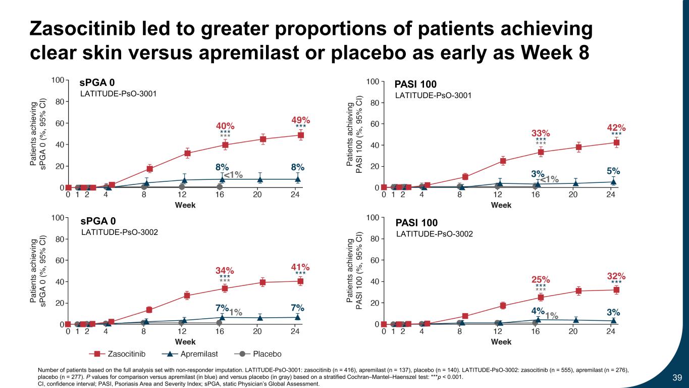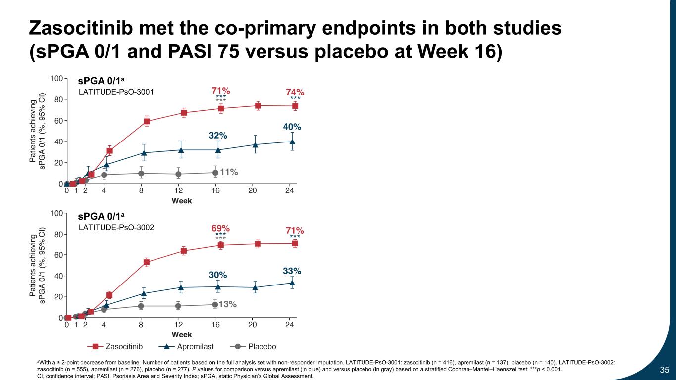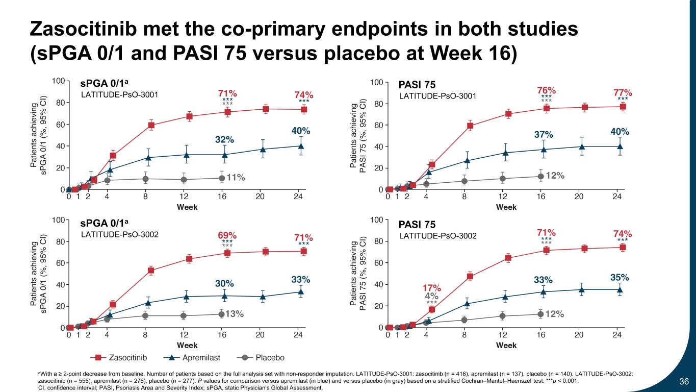 35 Zasocitinib met the co-primary endpoints in both studies (sPGA 0/1 and PASI 75 versus placebo at Week 16) aWith a ≥ 2-point decrease from baseline. Number of patients based on the full analysis set with non-responder imputation. LATITUDE-PsO-3001: zasocitinib (n = 416), apremilast (n = 137), placebo (n = 140). LATITUDE-PsO-3002: zasocitinib (n = 555), apremilast (n = 276), placebo (n = 277). P values for comparison versus apremilast (in blue) and versus placebo (in gray) based on a stratified Cochran–Mantel–Haenszel test: ***p < 0.001. CI, confidence interval; PASI, Psoriasis Area and Severity Index; sPGA, static Physician’s Global Assessment. sPGA 0/1a LATITUDE-PsO-3001 sPGA 0/1a LATITUDE-PsO-3002