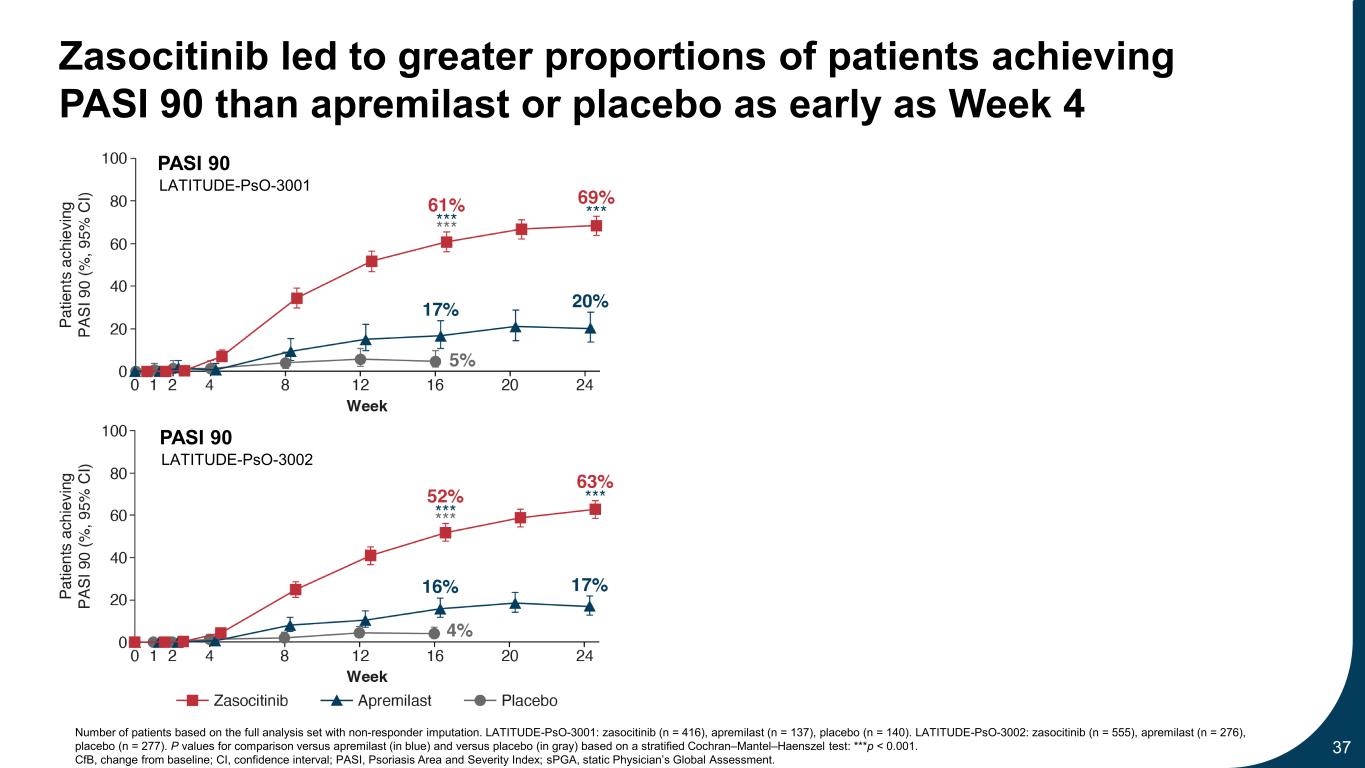 36 Zasocitinib met the co-primary endpoints in both studies (sPGA 0/1 and PASI 75 versus placebo at Week 16) aWith a ≥ 2-point decrease from baseline. Number of patients based on the full analysis set with non-responder imputation. LATITUDE-PsO-3001: zasocitinib (n = 416), apremilast (n = 137), placebo (n = 140). LATITUDE-PsO-3002: zasocitinib (n = 555), apremilast (n = 276), placebo (n = 277). P values for comparison versus apremilast (in blue) and versus placebo (in gray) based on a stratified Cochran–Mantel–Haenszel test: ***p < 0.001. CI, confidence interval; PASI, Psoriasis Area and Severity Index; sPGA, static Physician’s Global Assessment. PASI 75 LATITUDE-PsO-3001 PASI 75 LATITUDE-PsO-3002 sPGA 0/1a LATITUDE-PsO-3001 sPGA 0/1a LATITUDE-PsO-3002