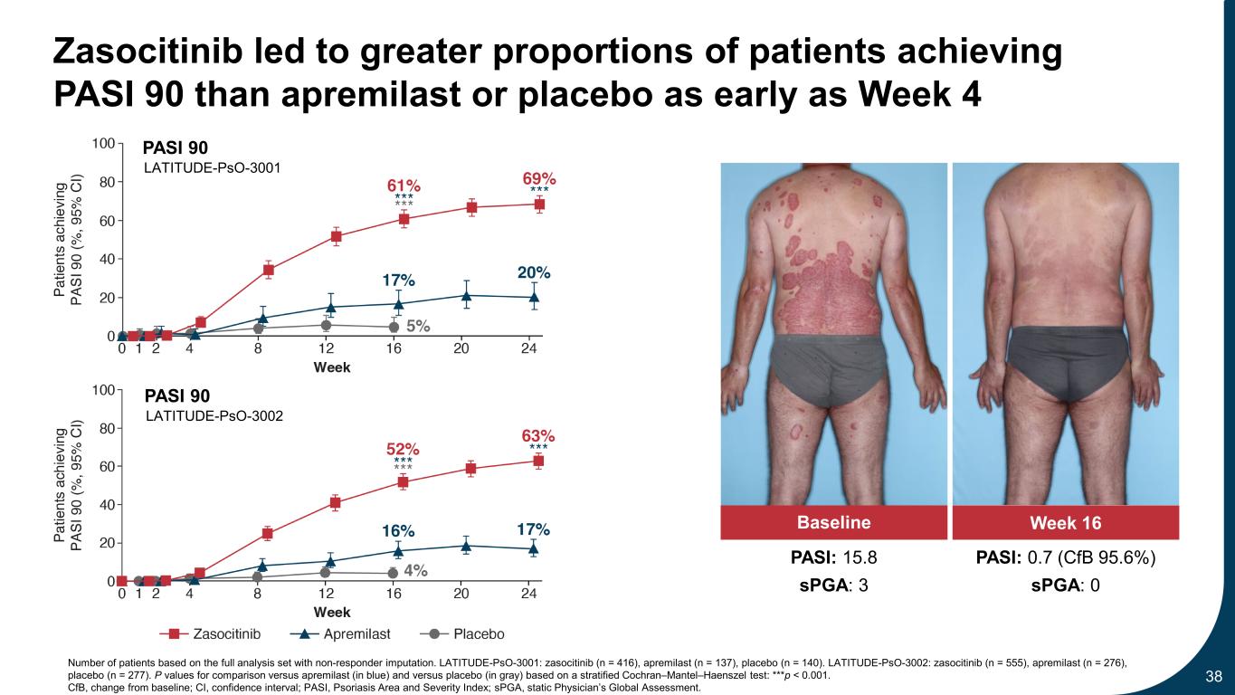 37 Zasocitinib led to greater proportions of patients achieving PASI 90 than apremilast or placebo as early as Week 4 Number of patients based on the full analysis set with non-responder imputation. LATITUDE-PsO-3001: zasocitinib (n = 416), apremilast (n = 137), placebo (n = 140). LATITUDE-PsO-3002: zasocitinib (n = 555), apremilast (n = 276), placebo (n = 277). P values for comparison versus apremilast (in blue) and versus placebo (in gray) based on a stratified Cochran–Mantel–Haenszel test: ***p < 0.001. CfB, change from baseline; CI, confidence interval; PASI, Psoriasis Area and Severity Index; sPGA, static Physician’s Global Assessment. PASI 90 LATITUDE-PsO-3001 PASI 90 LATITUDE-PsO-3002