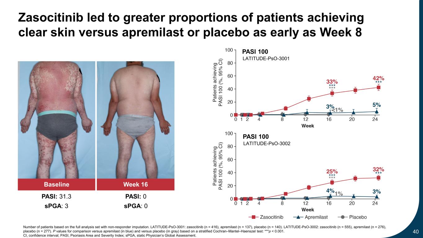 39 Zasocitinib led to greater proportions of patients achieving clear skin versus apremilast or placebo as early as Week 8 Number of patients based on the full analysis set with non-responder imputation. LATITUDE-PsO-3001: zasocitinib (n = 416), apremilast (n = 137), placebo (n = 140). LATITUDE-PsO-3002: zasocitinib (n = 555), apremilast (n = 276), placebo (n = 277). P values for comparison versus apremilast (in blue) and versus placebo (in gray) based on a stratified Cochran–Mantel–Haenszel test: ***p < 0.001. CI, confidence interval; PASI, Psoriasis Area and Severity Index; sPGA, static Physician’s Global Assessment. sPGA 0 LATITUDE-PsO-3001 sPGA 0 LATITUDE-PsO-3002 PASI 100 LATITUDE-PsO-3001 PASI 100 LATITUDE-PsO-3002