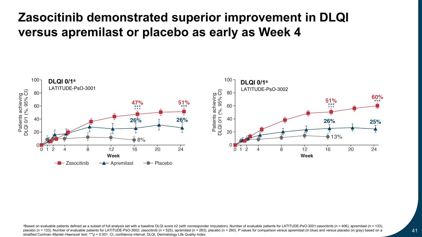 41 Zasocitinib demonstrated superior improvement in DLQI versus apremilast or placebo as early as Week 4 aBased on evaluable patients defined as a subset of full analysis set with a baseline DLQI score ≥2 (with nonresponder imputation). Number of evaluable patients for LATITUDE-PsO-3001:zasocitinib (n = 406), apremilast (n = 133), placebo (n = 133). Number of evaluable patients for LATITUDE-PsO-3002: zasocitinib (n = 525), apremilast (n = 263), placebo (n = 260). P values for comparison versus apremilast (in blue) and versus placebo (in gray) based on a stratified Cochran–Mantel–Haenszel test: ***p < 0.001. CI, confidence interval; DLQI, Dermatology Life Quality Index. DLQI 0/1a LATITUDE-PsO-3001 DLQI 0/1a LATITUDE-PsO-3002
