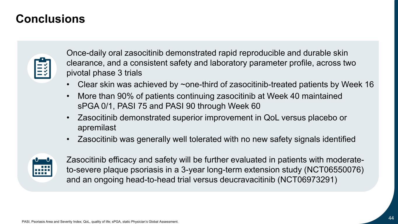 44 Conclusions Once-daily oral zasocitinib demonstrated rapid reproducible and durable skin clearance, and a consistent safety and laboratory parameter profile, across two pivotal phase 3 trials • Clear skin was achieved by ~one-third of zasocitinib-treated patients by Week 16 • More than 90% of patients continuing zasocitinib at Week 40 maintained sPGA 0/1, PASI 75 and PASI 90 through Week 60 • Zasocitinib demonstrated superior improvement in QoL versus placebo or apremilast • Zasocitinib was generally well tolerated with no new safety signals identified Zasocitinib efficacy and safety will be further evaluated in patients with moderate- to-severe plaque psoriasis in a 3-year long-term extension study (NCT06550076) and an ongoing head-to-head trial versus deucravacitinib (NCT06973291) PASI, Psoriasis Area and Severity Index; QoL, quality of life; sPGA, static Physician’s Global Assessment.