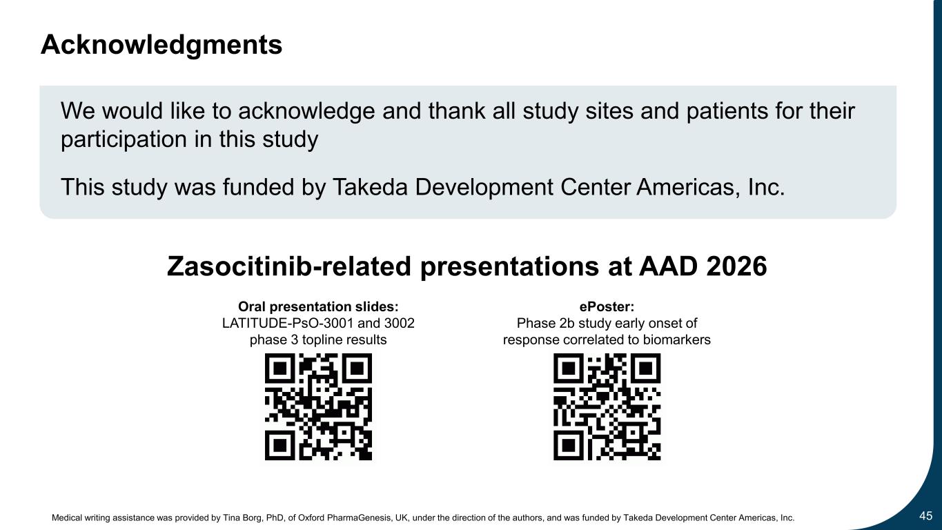 45 Acknowledgments We would like to acknowledge and thank all study sites and patients for their participation in this study This study was funded by Takeda Development Center Americas, Inc. Medical writing assistance was provided by Tina Borg, PhD, of Oxford PharmaGenesis, UK, under the direction of the authors, and was funded by Takeda Development Center Americas, Inc. Zasocitinib-related presentations at AAD 2026 Oral presentation slides: LATITUDE-PsO-3001 and 3002 phase 3 topline results ePoster: Phase 2b study early onset of response correlated to biomarkers