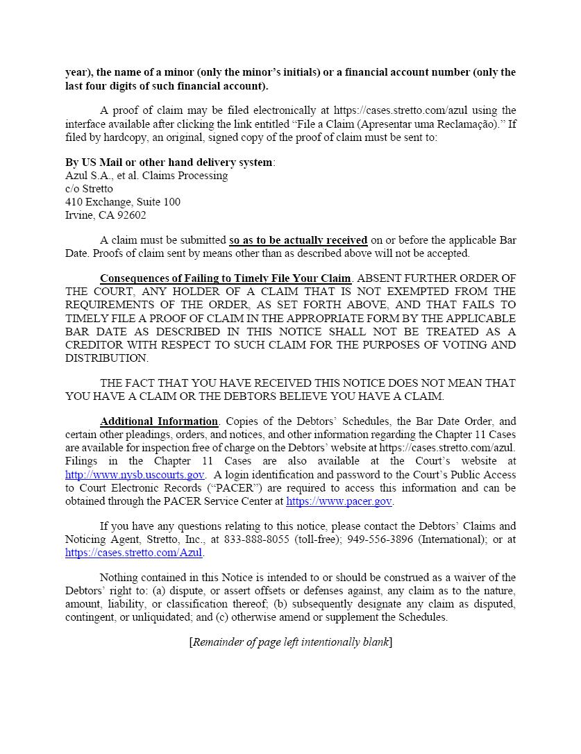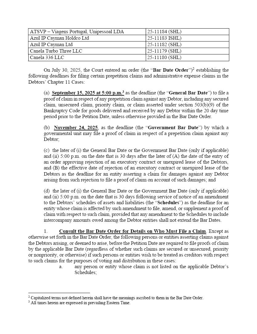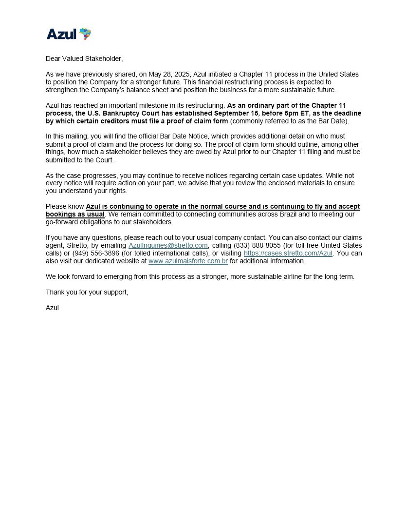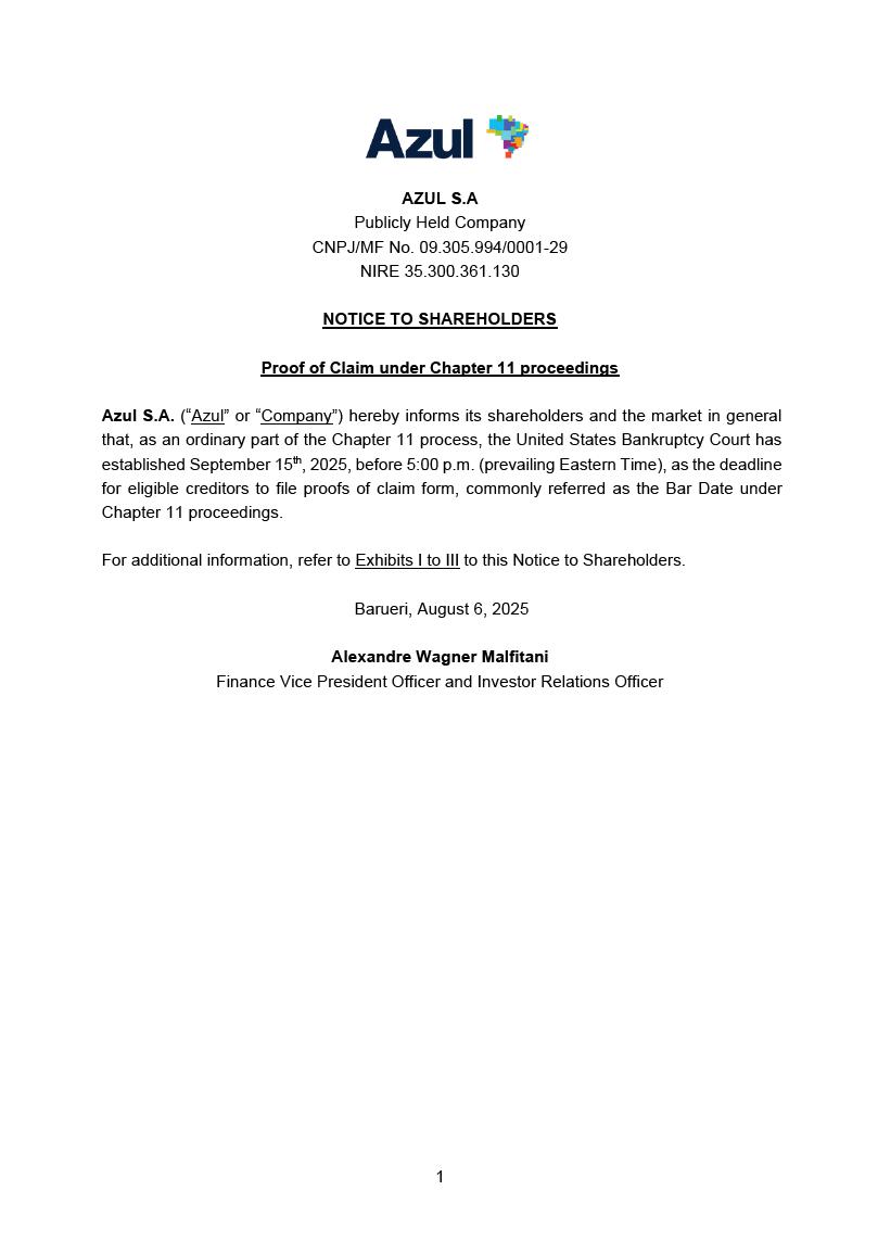 1 AZUL S.A Publicly Held Company CNPJ/MF No. 09.305.994/0001-29 NIRE 35.300.361.130 NOTICE TO SHAREHOLDERS Proof of Claim under Chapter 11 proceedings Azul S.A. (“Azul” or “Company”) hereby informs its shareholders and the market in general that, as an ordinary part of the Chapter 11 process, the United States Bankruptcy Court has established September 15th, 2025, before 5:00 p.m. (prevailing Eastern Time), as the deadline for eligible creditors to file proofs of claim form, commonly referred as the Bar Date under Chapter 11 proceedings. For additional information, refer to Exhibits I to III to this Notice to Shareholders. Barueri, August 6, 2025 Alexandre Wagner Malfitani Finance Vice President Officer and Investor Relations Officer 2 Exhibit I [Continued on the next page] Dear Valued Stakeholder, As we have previously shared, on May 28, 2025, Azul initiated a Chapter 11 process in the United States to position the Company for a stronger future. This financial restructuring process is expected to strengthen the Company’s balance sheet and position the business for a more sustainable future. Azul has reached an important milestone in its restructuring. As an ordinary part of the Chapter 11 process, the U.S. Bankruptcy Court has established September 15, before 5pm ET, as the deadline by which certain creditors must file a proof of claim form (commonly referred to as the Bar Date). In this mailing, you will find the official Bar Date Notice, which provides additional detail on who must submit a proof of claim and the process for doing so. The proof of claim form should outline, among other things, how much a stakeholder believes they are owed by Azul prior to our Chapter 11 filing and must be submitted to the Court. As the case progresses, you may continue to receive notices regarding certain case updates. While not every notice will require action on your part, we advise that you review the enclosed materials to ensure you understand your rights. Please know Azul is continuing to operate in the normal course and is continuing to fly and accept bookings as usual. We remain committed to connecting communities across Brazil and to meeting our go-forward obligations to our stakeholders. If you have any questions, please reach out to your usual company contact. You can also contact our claims agent, Stretto, by emailing AzulInquiries@stretto.com, calling (833) 888-8055 (for toll-free United States calls) or (949) 556-3896 (for tolled international calls), or visiting https://cases.stretto.com/Azul. You can also visit our dedicated website at www.azulmaisforte.com.br for additional information. We look forward to emerging from this process as a stronger, more sustainable airline for the long term. Thank you for your support, Azul 3 Exhibit II [Continued on the next page] UNITED STATES BANKRUPTCY COURT SOUTHERN DISTRICT OF NEW YORK In re: AZUL S.A., et al., Debtors.1 Chapter 11 Case No. 25-11176 (SHL) (Jointly Administered) NOTICE OF BAR DATES FOR FILING PROOFS OF CLAIM AGAINST THE DEBTORS On May 28, 2025 (collectively, the “Petition Date”), the following debtors (the “Debtors”) filed voluntary chapter 11 petitions in the United States Bankruptcy Court for the Southern District of New York (the “Court”): Debtors Case No. Azul S.A. 25-11176 (SHL) Azul Linhas Aéreas Brasileiras S.A. 25-11175 (SHL) IntelAzul S.A. 25-11177 (SHL) ATS Viagens E Turismo Ltda 25-11178 (SHL) Azul Secured Finance II LLP 25-11181 (SHL) Azul Secured Finance LLP 25-11189 (SHL) Canela Investments LLC 25-11191 (SHL) Azul Investments LLP 25-11190 (SHL) Azul Finance LLC 25-11192 (SHL) Azul Finance 2 LLC 25-11194 (SHL) Blue Sabia LLC 25-11195 (SHL) Azul SOL LLC 25-11188 (SHL) Azul Saira LLC 25-11187 (SHL) Azul Conecta LTDA 25-11186 (SHL) Cruzeiro Participações S.A. 25-11185 (SHL) 1 The debtors and debtors in possession in the chapter 11 cases, along with the last four digits of their respective tax, employer identification, or Delaware file numbers (as applicable), are as follows: Azul S.A. (CNPJ: 5.994); Azul Linhas Aéreas Brasileiras S.A. (CNPJ: 6.295); IntelAzul S.A. (CNPJ: 8.624); ATS Viagens e Turismo Ltda. (CNPJ: 3.213); Azul Secured Finance II LLP (EIN: 2619); Azul Secured Finance LLP (EIN: 9978); Canela Investments (EIN: 4987); Azul Investments LLP (EIN: 2977); Azul Finance LLC (EIN: 2283); Azul Finance 2 LLC (EIN: 4898); Blue Sabia LLC (EIN: 4187); Azul SOL LLC (EIN: 0525); Azul Saira LLC (EIN: 8801); Azul Conecta Ltda. (CNPJ: 3.318); Cruzeiro Participações S.A. (CNPJ: 7.497); ATSVP – Viagens Portugal, Unipessoal LDA. (NIF: 2968); Azul IP Cayman Holdco Ltd. (N/A); Azul IP Cayman Ltd. (N/A); Canela Turbo Three LLC (EIN: 4043); and Canela 336 LLC (Del. File No.: 6717). The Debtors’ corporate headquarters is located at Avenida Marcos Penteado de Ulhôa Rodrigues, nº 939, 8º floor, Edifício Jatobá, Condomínio Castelo Branco Office Park, Tamboré, 06460-040, Barueri, São Paulo, Brazil. CUSIP: 00501U106 / ISIN: US05501U1060 ATSVP – Viagens Portugal, Unipessoal LDA 25-11184 (SHL) Azul IP Cayman Holdco Ltd 25-11183 ISHL) Azul IP Cayman Ltd 25-11182 (SHL) Canela Turbo Three LLC 25-11179 (SHL) Canela 336 LLC 25-11180 (SHL) On July 30, 2025, the Court entered an order (the “Bar Date Order”)2 establishing the following deadlines for filing certain prepetition claims and administrative expense claims in the Debtors’ Chapter 11 Cases: (a) September 15, 2025 at 5:00 p.m.3 as the deadline (the “General Bar Date”) to file a proof of claim in respect of any prepetition claim against any Debtor, including any secured claim, unsecured claim, priority claim, or claim asserted under section 503(b)(9) of the Bankruptcy Code for goods delivered and received by any Debtor within the 20 day time period prior to the Petition Date, unless otherwise provided in the Bar Date Order. (b) November 24, 2025, as the deadline (the “Government Bar Date”) by which a governmental unit may file a proof of 