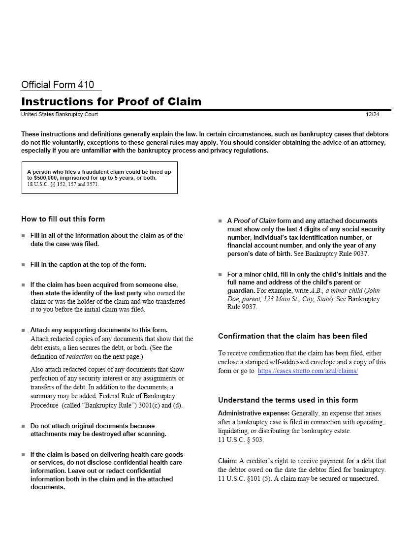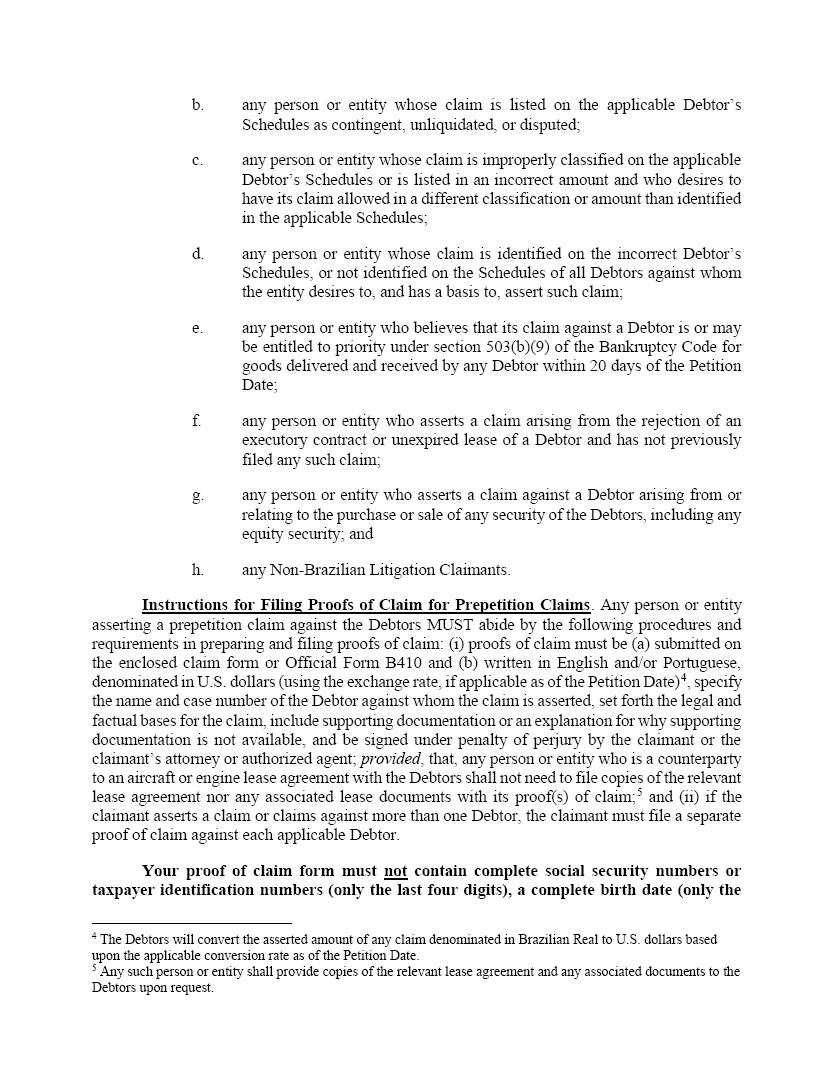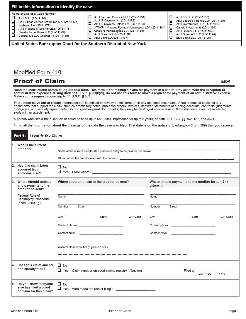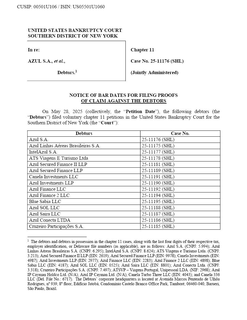 1 AZUL S.A Publicly Held Company CNPJ/MF No. 09.305.994/0001-29 NIRE 35.300.361.130 NOTICE TO SHAREHOLDERS Proof of Claim under Chapter 11 proceedings Azul S.A. (“Azul” or “Company”) hereby informs its shareholders and the market in general that, as an ordinary part of the Chapter 11 process, the United States Bankruptcy Court has established September 15th, 2025, before 5:00 p.m. (prevailing Eastern Time), as the deadline for eligible creditors to file proofs of claim form, commonly referred as the Bar Date under Chapter 11 proceedings. For additional information, refer to Exhibits I to III to this Notice to Shareholders. Barueri, August 6, 2025 Alexandre Wagner Malfitani Finance Vice President Officer and Investor Relations Officer 2 Exhibit I [Continued on the next page] Dear Valued Stakeholder, As we have previously shared, on May 28, 2025, Azul initiated a Chapter 11 process in the United States to position the Company for a stronger future. This financial restructuring process is expected to strengthen the Company’s balance sheet and position the business for a more sustainable future. Azul has reached an important milestone in its restructuring. As an ordinary part of the Chapter 11 process, the U.S. Bankruptcy Court has established September 15, before 5pm ET, as the deadline by which certain creditors must file a proof of claim form (commonly referred to as the Bar Date). In this mailing, you will find the official Bar Date Notice, which provides additional detail on who must submit a proof of claim and the process for doing so. The proof of claim form should outline, among other things, how much a stakeholder believes they are owed by Azul prior to our Chapter 11 filing and must be submitted to the Court. As the case progresses, you may continue to receive notices regarding certain case updates. While not every notice will require action on your part, we advise that you review the enclosed materials to ensure you understand your rights. Please know Azul is continuing to operate in the normal course and is continuing to fly and accept bookings as usual. We remain committed to connecting communities across Brazil and to meeting our go-forward obligations to our stakeholders. If you have any questions, please reach out to your usual company contact. You can also contact our claims agent, Stretto, by emailing AzulInquiries@stretto.com, calling (833) 888-8055 (for toll-free United States calls) or (949) 556-3896 (for tolled international calls), or visiting https://cases.stretto.com/Azul. You can also visit our dedicated website at www.azulmaisforte.com.br for additional information. We look forward to emerging from this process as a stronger, more sustainable airline for the long term. Thank you for your support, Azul 3 Exhibit II [Continued on the next page] UNITED STATES BANKRUPTCY COURT SOUTHERN DISTRICT OF NEW YORK In re: AZUL S.A., et al., Debtors.1 Chapter 11 Case No. 25-11176 (SHL) (Jointly Administered) NOTICE OF BAR DATES FOR FILING PROOFS OF CLAIM AGAINST THE DEBTORS On May 28, 2025 (collectively, the “Petition Date”), the following debtors (the “Debtors”) filed voluntary chapter 11 petitions in the United States Bankruptcy Court for the Southern District of New York (the “Court”): Debtors Case No. Azul S.A. 25-11176 (SHL) Azul Linhas Aéreas Brasileiras S.A. 25-11175 (SHL) IntelAzul S.A. 25-11177 (SHL) ATS Viagens E Turismo Ltda 25-11178 (SHL) Azul Secured Finance II LLP 25-11181 (SHL) Azul Secured Finance LLP 25-11189 (SHL) Canela Investments LLC 25-11191 (SHL) Azul Investments LLP 25-11190 (SHL) Azul Finance LLC 25-11192 (SHL) Azul Finance 2 LLC 25-11194 (SHL) Blue Sabia LLC 25-11195 (SHL) Azul SOL LLC 25-11188 (SHL) Azul Saira LLC 25-11187 (SHL) Azul Conecta LTDA 25-11186 (SHL) Cruzeiro Participações S.A. 25-11185 (SHL) 1 The debtors and debtors in possession in the chapter 11 cases, along with the last four digits of their respective tax, employer identification, or Delaware file numbers (as applicable), are as follows: Azul S.A. (CNPJ: 5.994); Azul Linhas Aéreas Brasileiras S.A. (CNPJ: 6.295); IntelAzul S.A. (CNPJ: 8.624); ATS Viagens e Turismo Ltda. (CNPJ: 3.213); Azul Secured Finance II LLP (EIN: 2619); Azul Secured Finance LLP (EIN: 9978); Canela Investments (EIN: 4987); Azul Investments LLP (EIN: 2977); Azul Finance LLC (EIN: 2283); Azul Finance 2 LLC (EIN: 4898); Blue Sabia LLC (EIN: 4187); Azul SOL LLC (EIN: 0525); Azul Saira LLC (EIN: 8801); Azul Conecta Ltda. (CNPJ: 3.318); Cruzeiro Participações S.A. (CNPJ: 7.497); ATSVP – Viagens Portugal, Unipessoal LDA. (NIF: 2968); Azul IP Cayman Holdco Ltd. (N/A); Azul IP Cayman Ltd. (N/A); Canela Turbo Three LLC (EIN: 4043); and Canela 336 LLC (Del. File No.: 6717). The Debtors’ corporate headquarters is located at Avenida Marcos Penteado de Ulhôa Rodrigues, nº 939, 8º floor, Edifício Jatobá, Condomínio Castelo Branco Office Park, Tamboré, 06460-040, Barueri, São Paulo, Brazil. CUSIP: 00501U106 / ISIN: US05501U1060 ATSVP – Viagens Portugal, Unipessoal LDA 25-11184 (SHL) Azul IP Cayman Holdco Ltd 25-11183 ISHL) Azul IP Cayman Ltd 25-11182 (SHL) Canela Turbo Three LLC 25-11179 (SHL) Canela 336 LLC 25-11180 (SHL) On July 30, 2025, the Court entered an order (the “Bar Date Order”)2 establishing the following deadlines for filing certain prepetition claims and administrative expense claims in the Debtors’ Chapter 11 Cases: (a) September 15, 2025 at 5:00 p.m.3 as the deadline (the “General Bar Date”) to file a proof of claim in respect of any prepetition claim against any Debtor, including any secured claim, unsecured claim, priority claim, or claim asserted under section 503(b)(9) of the Bankruptcy Code for goods delivered and received by any Debtor within the 20 day time period prior to the Petition Date, unless otherwise provided in the Bar Date Order. (b) November 24, 2025, as the deadline (the “Government Bar Date”) by which a governmental unit may file a proof of 