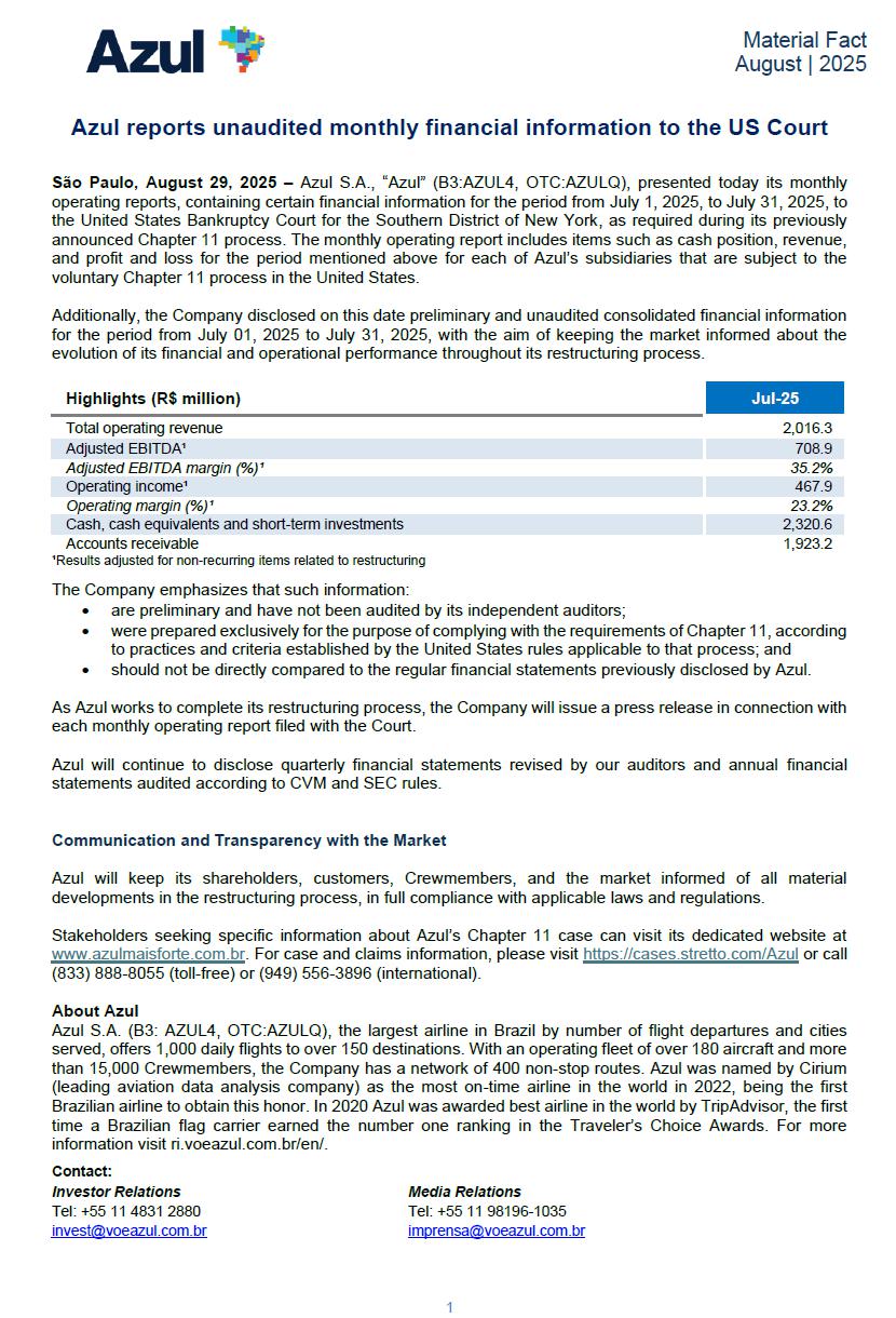 1 Material Fact August | 2025 Azul reports unaudited monthly financial information to the US Court São Paulo, August 29, 2025 – Azul S.A., “Azul” (B3:AZUL4, OTC:AZULQ), presented today its monthly operating reports, containing certain financial information for the period from July 1, 2025, to July 31, 2025, to the United States Bankruptcy Court for the Southern District of New York, as required during its previously announced Chapter 11 process. The monthly operating report includes items such as cash position, revenue, and profit and loss for the period mentioned above for each of Azul’s subsidiaries that are subject to the voluntary Chapter 11 process in the United States. Additionally, the Company disclosed on this date preliminary and unaudited consolidated financial information for the period from July 01, 2025 to July 31, 2025, with the aim of keeping the market informed about the evolution of its financial and operational performance throughout its restructuring process. Highlights (R$ million) Jul-25 Total operating revenue 2,016.3 Adjusted EBITDA¹ 708.9 Adjusted EBITDA margin (%)¹ 35.2% Operating income¹ 467.9 Operating margin (%)¹ 23.2% Cash, cash equivalents and short-term investments 2,320.6 Accounts receivable 1,923.2 ¹Results adjusted for non-recurring items related to restructuring The Company emphasizes that such information: • are preliminary and have not been audited by its independent auditors; • were prepared exclusively for the purpose of complying with the requirements of Chapter 11, according to practices and criteria established by the United States rules applicable to that process; and • should not be directly compared to the regular financial statements previously disclosed by Azul. As Azul works to complete its restructuring process, the Company will issue a press release in connection with each monthly operating report filed with the Court. Azul will continue to disclose quarterly financial statements revised by our auditors and annual financial statements audited according to CVM and SEC rules. Communication and Transparency with the Market Azul will keep its shareholders, customers, Crewmembers, and the market informed of all material developments in the restructuring process, in full compliance with applicable laws and regulations. Stakeholders seeking specific information about Azul’s Chapter 11 case can visit its dedicated website at www.azulmaisforte.com.br. For case and claims information, please visit https://cases.stretto.com/Azul or call (833) 888-8055 (toll-free) or (949) 556-3896 (international). About Azul Azul S.A. (B3: AZUL4, OTC:AZULQ), the largest airline in Brazil by number of flight departures and cities served, offers 1,000 daily flights to over 150 destinations. With an operating fleet of over 180 aircraft and more than 15,000 Crewmembers, the Company has a network of 400 non-stop routes. Azul was named by Cirium (leading aviation data analysis company) as the most on-time airline in the world in 2022, being the first Brazilian airline to obtain this honor. In 2020 Azul was awarded best airline in the world by TripAdvisor, the first time a Brazilian flag carrier earned the number one ranking in the Traveler’s Choice Awards. For more information visit ri.voeazul.com.br/en/. Contact: Investor Relations Media Relations Tel: +55 11 4831 2880 Tel: +55 11 98196-1035 invest@voeazul.com.br imprensa@voeazul.com.br