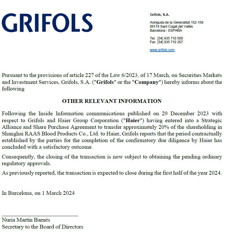 Grifols, S.A. Avinguda de la Generalitat 152-158 08174 Sant Cugat del Vallès Barcelona - ESPAÑA Tel. [34] 935 710 500 Fax [34] 935 710 267 www.grifols.com Pursuant to the provisions of article 227 of the Law 6/2023, of 17 March, on Securities Markets and Investment Services, Grifols, S.A. ("Grifols" or the "Company") hereby informs about the following OTHER RELEVANT INFORMATION Following the Inside Information communications published on 29 December 2023 with respect to Grifols and Haier Group Corporation ("Haier") having entered into a Strategic Alliance and Share Purchase Agreement to transfer approximately 20% of the shareholding in Shanghai RAAS Blood Products Co., Ltd. to Haier, Grifols reports that the period contractually established by the parties for the completion of the confirmatory due diligence by Haier has concluded with a satisfactory outcome. Consequently, the closing of the transaction is now subject to obtaining the pending ordinary regulatory approvals. As previously reported, the transaction is expected to close during the first half of the year 2024. In Barcelona, on 1 March 2024 __________________________ Nuria Martín Barnés Secretary to the Board of Directors