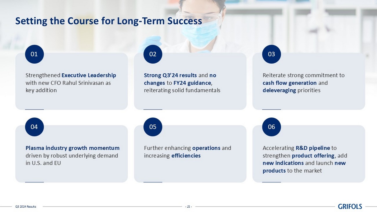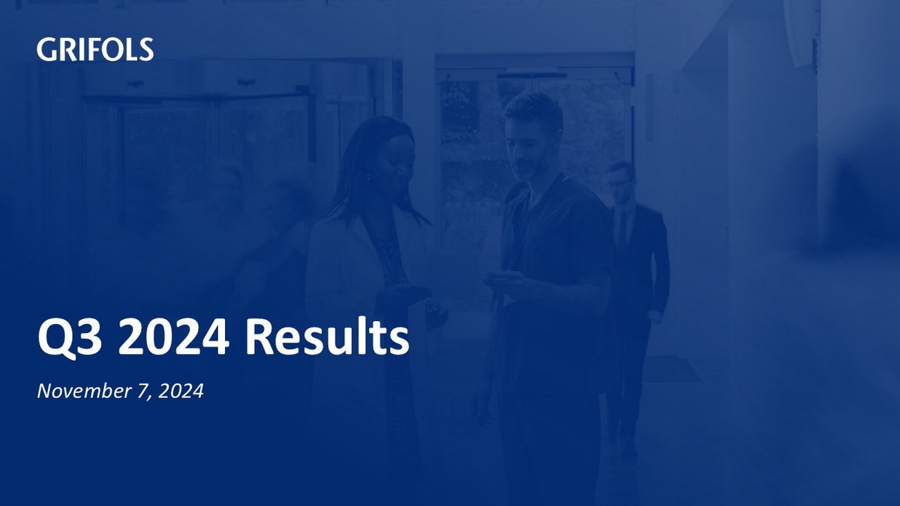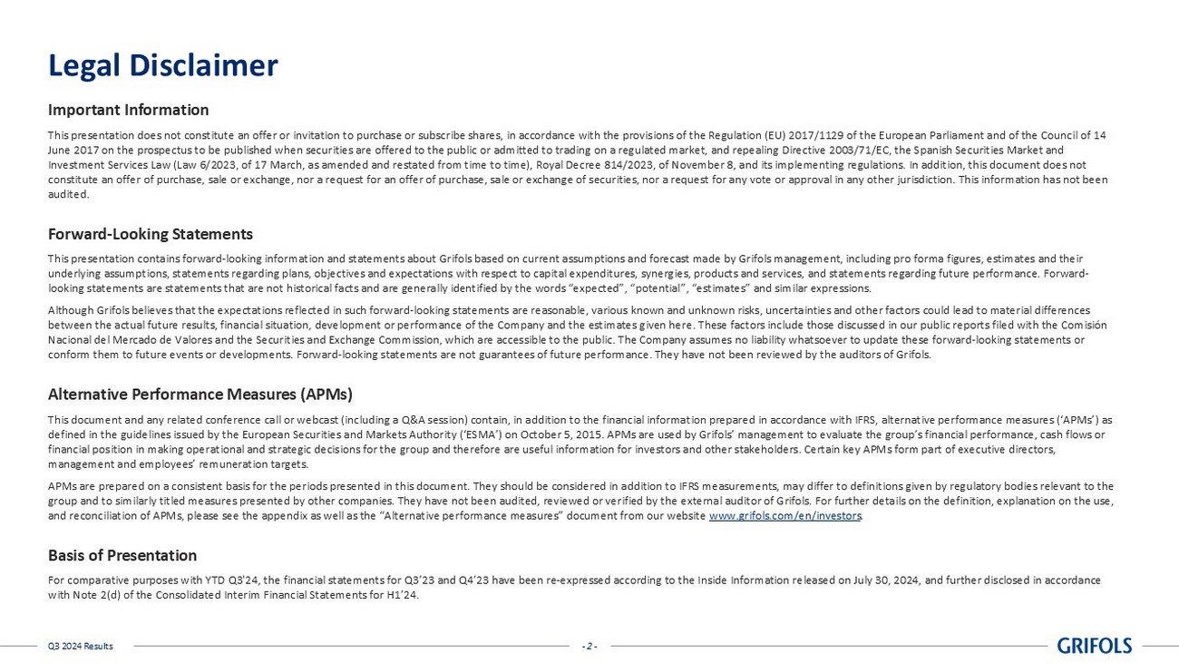 - 2 - Q3 2024 Results Legal Disclaimer Important Information This presentation does not constitute an offer or invitation to purchase or subscribe shares, in accordance with the provisio ns of the Regulation (EU) 2017/1129 of the European Parliament and of the Council of 14 June 2017 on the prospectus to be published when securities are offered to the public or admitted to trading on a regulated m ark et, and repealing Directive 2003/71/EC, the Spanish Securities Market and Investment Services Law (Law 6/2023, of 17 March, as amended and restated from time to time), Royal Decree 814/2023, of Novem ber 8, and its implementing regulations. In addition, this document does not constitute an offer of purchase, sale or exchange, nor a request for an offer of purchase, sale or exchange of securities, no r a request for any vote or approval in any other jurisdiction. This information has not been audited. Forward - Looking Statements This presentation contains forward - looking information and statements about Grifols based on current assumptions and forecast ma de by Grifols management, including pro forma figures, estimates and their underlying assumptions, statements regarding plans, objectives and expectations with respect to capital expenditures, synergi es, products and services, and statements regarding future performance. Forward - looking statements are statements that are not historical facts and are generally identified by the words “expected”, “potent ial ”, “estimates” and similar expressions. Although Grifols believes that the expectations reflected in such forward - looking statements are reasonable, various known and u nknown risks, uncertainties and other factors could lead to material differences between the actual future results, financial situation, development or performance of the Company and the estimates given her e. These factors include those discussed in our public reports filed with the Comisión Nacional del Mercado de Valores and the Securities and Exchange Commission, which are accessible to the public. The Company a ssu mes no liability whatsoever to update these forward - looking statements or conform them to future events or developments. Forward - looking statements are not guarantees of future performance. They have no t been reviewed by the auditors of Grifols. Alternative Performance Measures (APMs) This document and any related conference call or webcast (including a Q&A session) contain, in addition to the financial info rma tion prepared in accordance with IFRS, alternative performance measures (‘APMs’) as defined in the guidelines issued by the European Securities and Markets Authority (‘ESMA’) on October 5, 2015. APMs are used by Grifols’ management to evaluate the group’s financial performance, cash flows or financial position in making operational and strategic decisions for the group and therefore are useful information for inves tor s and other stakeholders. Certain key APMs form part of executive directors, management and employees’ remuneration targets. APMs are prepared on a consistent basis for the periods presented in this document. They should be considered in addition to IFR S measurements, may differ to definitions given by regulatory bodies relevant to the group and to similarly titled measures presented by other companies. They have not been audited, reviewed or verified by the ext ernal auditor of Grifols. For further details on the definition, explanation on the use, and reconciliation of APMs, please see the appendix as well as the “Alternative performance measures” document from our websi te www.grifols.com/en/investors . Basis of Presentation For comparative purposes with YTD Q3'24, the financial statements for Q3’23 and Q4’23 have been re - expressed according to the In side Information released on July 30, 2024, and further disclosed in accordance with Note 2(d) of the Consolidated Interim Financial Statements for H1’24.