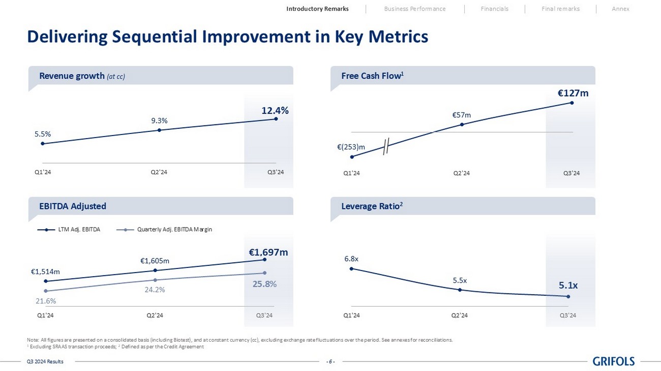 - 5 - Q3 2024 Results Accelerating Performance and Executing on Strategy Note: All figures are presented on a consolidated basis (including Biotest), and at constant currency (cc), excluding exchang e r ate fluctuations over the period. See annexes for reconciliations. 1 Excluding SRAAS transaction; 2 Defined as per the Credit Agreement; refer to Annex; 2 Corporate Sustainability Assessment (CSA). REVENUE €1,793m EBITDA ADJ. €462m Margin 25.8% FREE CASH FLOW 1 €127m LEVERAGE RATIO 2 5.1x Q3 Figures Variation vs. PY (% at cc) Introductory Remarks Business Performance Financials Final remarks Annex • Solid growth across all Business Units and core markets • Margin expansion driven by product mix, lower Cost per liter and operational leverage • Liquidity EUR 704m • Reiterating FY24 guidance • Efficient management of supply • Cost Per Liter continued to decline • Executing on initiatives to increase plasma and manufacturing efficiencies • On track to achieve 2024 milestones • Fibrinogen ’s regulatory progress started in EU and on track in the U.S. • GigaGen awarded U.S. BARDA contract to develop its recombinant polyclonal antibody therapeutic platform • Advancing on our sustainability agenda • Achieved our highest - ever score in the 2024 S&P Global CSA 2 • Awarded Gold Medal by EcoVadis Financials Plasma Innovation Sustainability +12.4% +26.7% +€97m 6.8x Q1’24