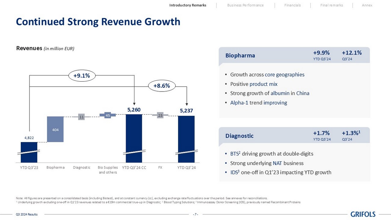 - 6 - Q3 2024 Results Delivering Sequential Improvement in Key Metrics €(253)m €57m €127m Q1'24 Q2'24 Q3'24 6.8 x 5.5 x 5.1 x Q1'24 Q2'24 Q3'24 5.5% 9.3% 12.4% Q1'24 Q2'24 Q3'24 Quarterly Adj. EBITDA Margin LTM Adj. EBITDA Note: All figures are presented on a consolidated basis (including Biotest), and at constant currency (cc), excluding exchang e r ate fluctuations over the period. See annexes for reconciliations. 1 Excluding SRAAS transaction proceeds; 2 Defined as per the Credit Agreement Introductory Remarks Business Performance Financials Final remarks Annex Revenue growth (at cc) EBITDA Adjusted € 1,514 m € 1,605 m € 1,697 m 21.6% 24.2% 25.8% 18% 20% 22% 24% 26% 28% 1300 1350 1400 1450 1500 1550 1600 1650 1700 Q1'24 Q2'24 Q3'24 Free Cash Flow 1 Leverage Ratio 2