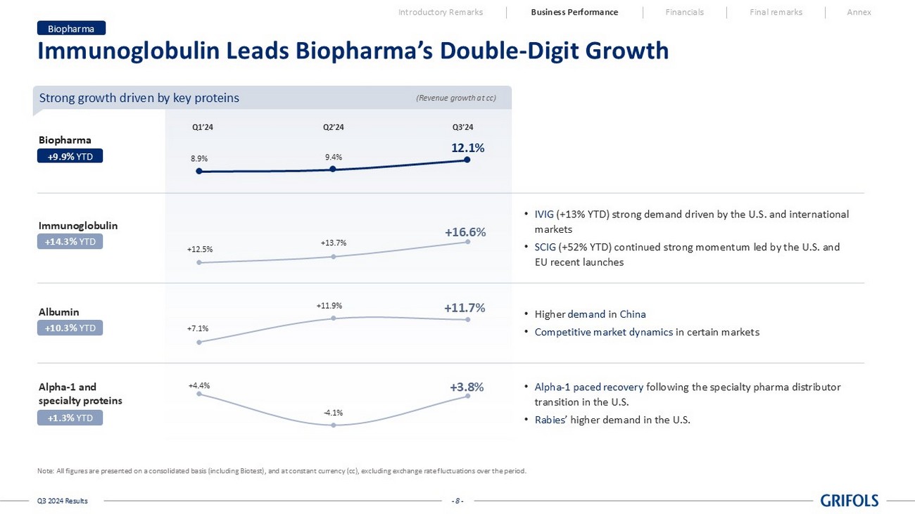 - 7 - Q3 2024 Results Continued Strong Revenue Growth Note: All figures are presented on a consolidated basis (including Biotest), and at constant currency (cc), excluding exchang e r ate fluctuations over the period. See annexes for reconciliations. 1 Underlying growth excluding one - off in Q1’23 revenues related to a €19m commercial true - up in Diagnostic; 2 Blood Typing Solutions; 3 Immunoassay Donor Screening (IDS), previously named Recombinant Proteins 4,822 5,260 11 45 23 1 2 3 4 5 6 7 5,237 YTD Q3’23 Biopharma Diagnostic Bio Supplies and others YTD Q3’24 CC FX YTD Q3’24 404 +9.1% +8.6% • Growth across core geographies • Positive product mix • Strong growth of albumin in China • Alpha - 1 trend improving Revenues (in million EUR) Biopharma +12.1% Q3’24 • BTS 2 driving growth at double - digits • Strong underlying NAT business • IDS 3 one - off in Q1’23 impacting YTD growth Diagnostic +1.3% 1 Q3’24 +9.9% YTD Q3’24 +1.7% YTD Q3’24 Introductory Remarks Business Performance Financials Final remarks Annex
