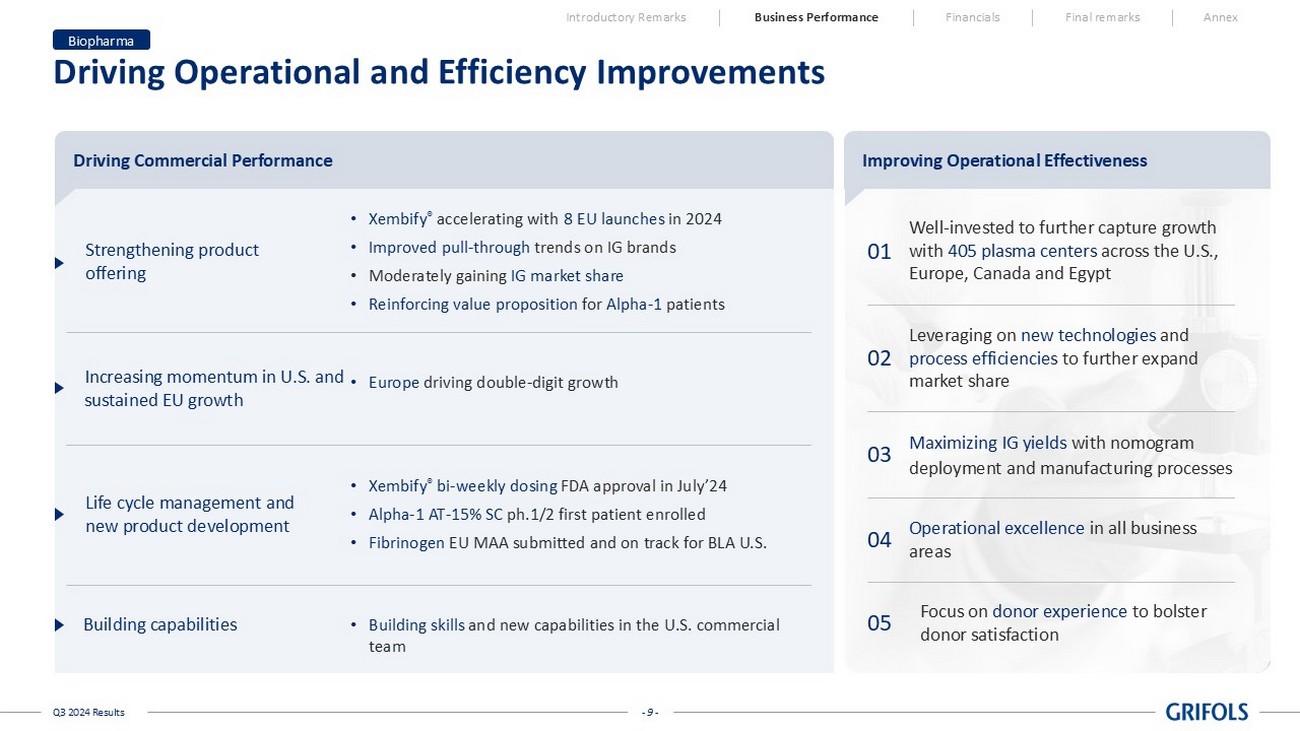 - 8 - Q3 2024 Results Immunoglobulin Leads Biopharma’s Double - Digit Growth Introductory Remarks Business Performance Financials Final remarks Annex Note: All figures are presented on a consolidated basis (including Biotest), and at constant currency (cc), excluding exchang e r ate fluctuations over the period. Biopharma Q1’24 Q2’24 Q3’24 8.9% 9.4% 12.1% +9.9% YTD • IVIG (+13% YTD) strong demand driven by the U.S. and international markets • SCIG (+52% YTD) continued strong momentum led by the U.S. and EU recent launches • Alpha - 1 paced recovery following the specialty pharma distributor transition in the U.S. • Rabies ’ higher demand in the U.S. • Higher demand in China • Competitive market dynamics in certain markets +12.5% +13.7% +16.6% +7.1% +11.9% +11.7% +4.4% - 4.1% +3.8% Immunoglobulin +14.3% YTD Albumin +10.3% YTD Alpha - 1 and specialty proteins +1.3% YTD Protein Strong growth driven by key proteins (Revenue growth at cc) Biopharma