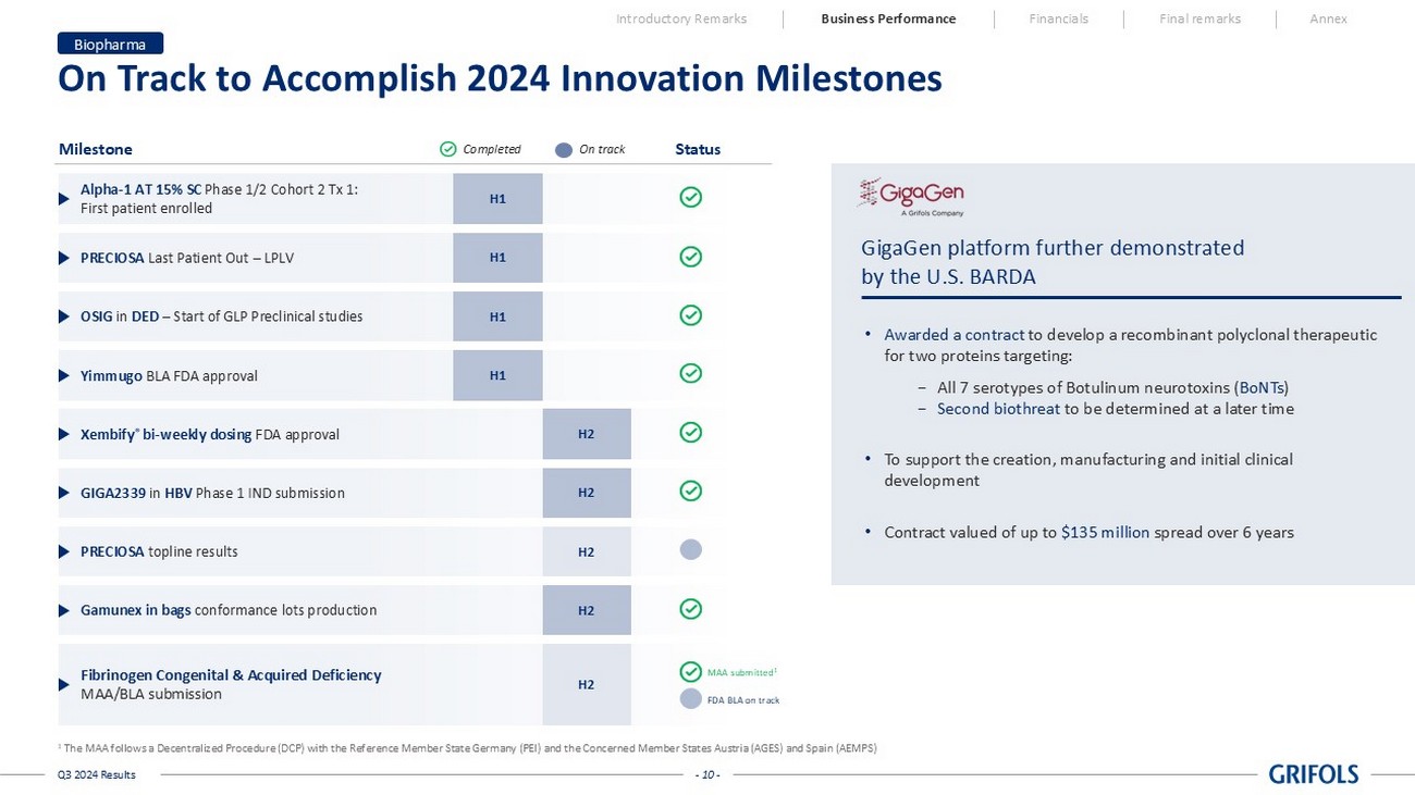 - 9 - Q3 2024 Results Driving Operational and Efficiency Improvements Introductory Remarks Business Performance Financials Final remarks Annex Well - invested to further capture growth with 405 plasma centers across the U.S., Europe , Canada and Egypt 01 Maximizing IG yields with nomogram deployment and manufacturing processes 03 Operational excellence in all business areas 04 Focus on donor experience to bolster donor satisfaction 05 Leveraging on new technologies and process efficiencies to further expand market share 02 Driving Commercial Performance Improving Operational Effectiveness Increasing momentum in U.S. and sustained EU growth • Europe driving double - digit growth Life cycle management and new product development • Xembify ® bi - weekly dosing FDA approval in July’24 • Alpha - 1 AT - 15% SC ph.1/2 first patient enrolled • Fibrinogen EU MAA submitted and on track for BLA U.S. Building capabilities • Building skills and new capabilities in the U.S. commercial team • Xembify ® accelerating with 8 EU launches in 2024 • Improved pull - through trends on IG brands • Moderately gaining IG market share • Reinforcing value proposition for Alpha - 1 patients Strengthening product offering Biopharma