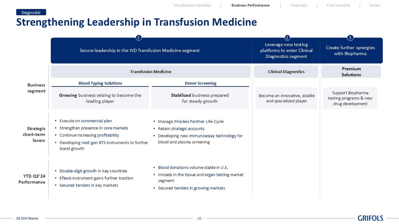 - 11 - Q3 2024 Results Strengthening Leadership in Transfusion Medicine Diagnostic Introductory Remarks Business Performance Financials Final remarks Annex Business segment Secure leadership in the IVD Transfusion Medicine segment 1 Become an innovative, sizable and specialized player Clinical Diagnostics Leverage new testing platforms to enter Clinical Diagnostics segment 2 Transfusion Medicine Growing business seizing to become the leading player Blood Typing Solutions Stabilized business prepared for steady growth Donor Screening YTD Q3’24 Performance • Double - digit growth in key countries • Eflexis instrument gains further traction • Secured tenders in key markets • Blood donations volume stable in U.S. • I nroads in the tissue and organ testing market segment • Secured tenders in growing markets Strategic short - term levers • Manage Procleix Panther Life - Cycle • Retain strategic accounts • Developing new immunoassay technology for blood and plasma screening • Execute on commercial plan • Strengthen presence in core markets • Continue increasing profitability • Developing next - gen BTS instruments to further boost growth Premium Solutions Support Biopharma testing programs & new drug development Create further synergies with Biopharma 3