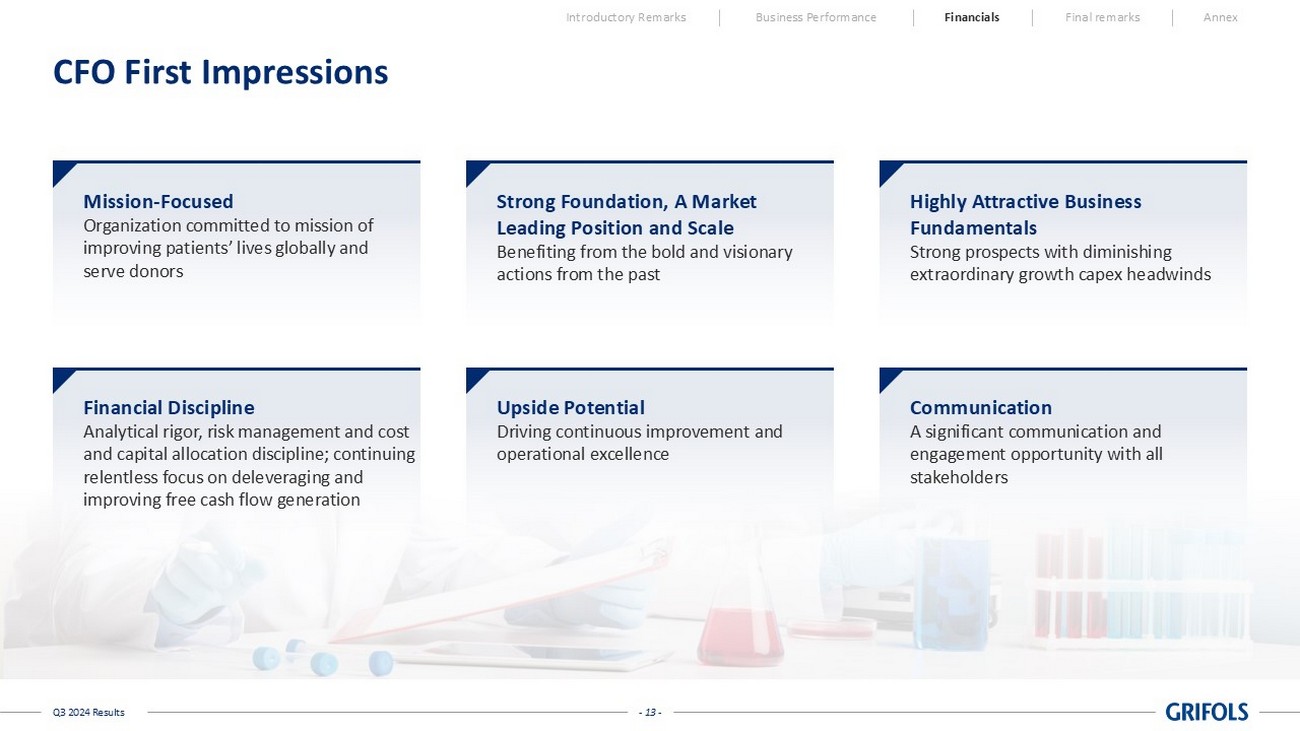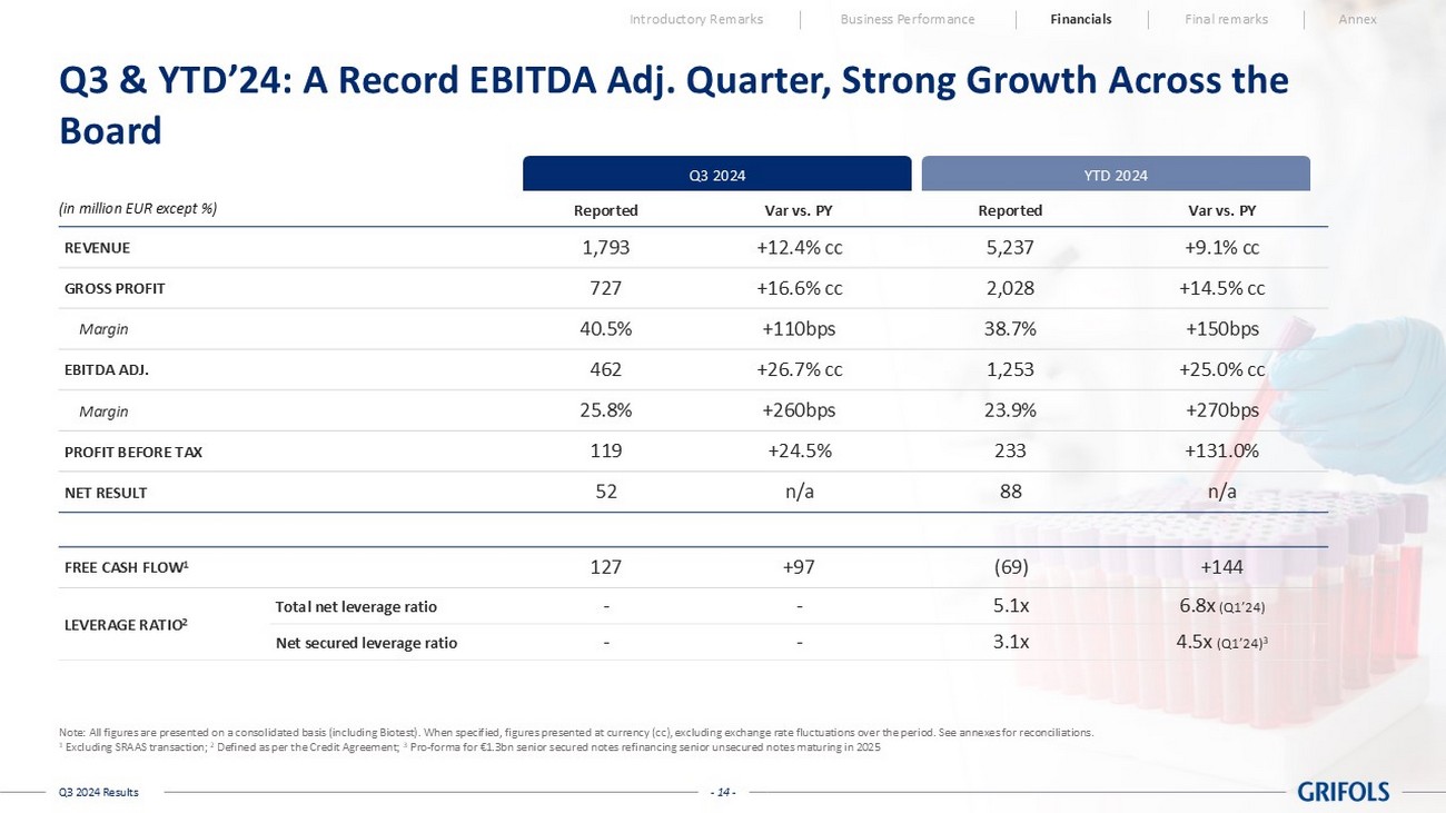 - 13 - Q3 2024 Results Introductory Remarks Business Performance Financials Final remarks Annex CFO First Impressions Mission - Focused Organization committed to mission of improving patients’ lives globally and serve donors Strong Foundation, A Market Leading Position and Scale Benefiting from the bold and visionary actions from the past Highly Attractive Business Fundamentals Strong prospects with diminishing extraordinary growth capex headwinds Financial Discipline Analytical rigor, risk management and cost and capital allocation discipline; continuing relentless focus on deleveraging and improving free cash flow generation Upside Potential Driving continuous improvement and operational excellence Communication A significant communication and engagement opportunity with all stakeholders