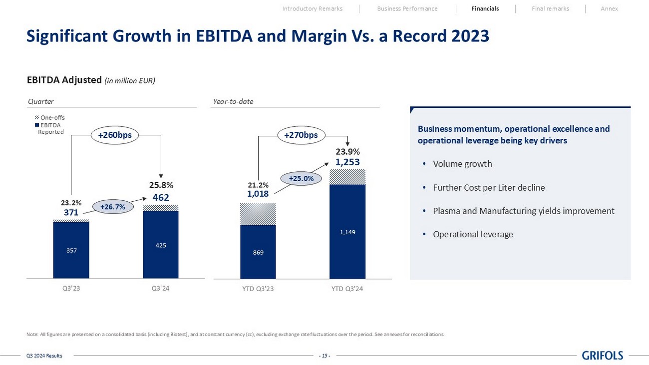 - 14 - Q3 2024 Results Q3 & YTD’24: A Record EBITDA Adj. Quarter, Strong Growth Across the Board Note: All figures are presented on a consolidated basis (including Biotest). When specified, figures presented at currency (c c), excluding exchange rate fluctuations over the period. See annexes for reconciliations. 1 Excluding SRAAS transaction; 2 Defined as per the Credit Agreement; 3 Pro - forma for €1.3bn senior secured notes refinancing senior unsecured notes maturing in 2025 Introductory Remarks Business Performance Financials Final remarks Annex Var vs. PY Reported Var vs. PY Reported +9.1% cc 5,237 +12.4% cc 1,793 REVENUE +14.5% cc 2,028 +16.6% cc 727 GROSS PROFIT +150bps 38.7% +110bps 40.5% Margin +25.0% cc 1,253 +26.7% cc 462 EBITDA ADJ. +270bps 23.9% +260bps 25.8% Margin +131.0% 233 +24.5% 119 PROFIT BEFORE TAX n/a 88 n/a 52 NET RESULT +144 (69) +97 127 FREE CASH FLOW 1 6.8x (Q1’24) 5.1x - - Total net leverage ratio LEVERAGE RATIO 2 4.5x (Q1’24) 3 3.1x - - Net secured leverage ratio Q3 2024 YTD 2024 (in million EUR except %)