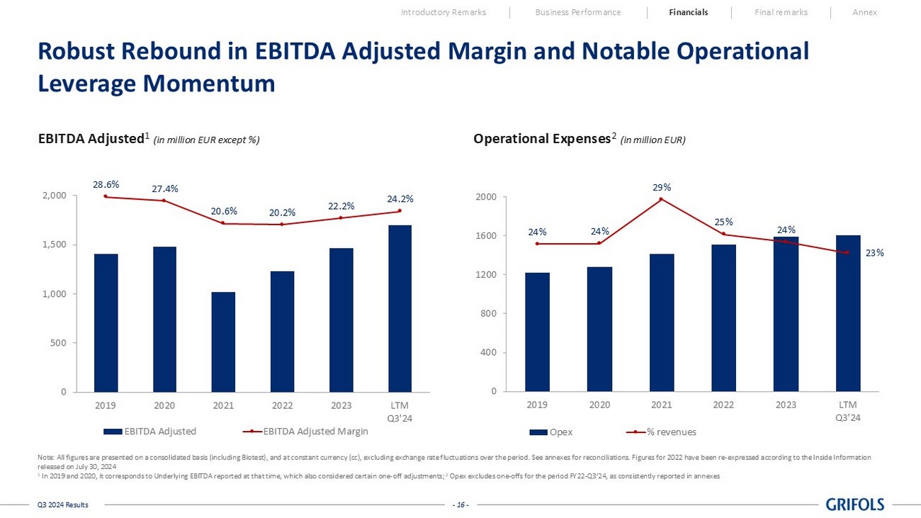 - 15 - Q3 2024 Results Business momentum, operational excellence and operational leverage being key drivers • Volume growth • Further Cost per Liter decline • Plasma and Manufacturing yields improvement • Operational leverage Significant Growth in EBITDA and Margin Vs. a Record 2023 Introductory Remarks Business Performance Financials Final remarks Annex EBITDA Adjusted (in million EUR) Note: All figures are presented on a consolidated basis (including Biotest), and at constant currency (cc), excluding exchang e r ate fluctuations over the period. See annexes for reconciliations. 357 425 Q3'23 Q3'24 One-offs EBITDA Reported 371 462 25.8% 23.2% Quarter Reported +260bps +26.7% 869 1,149 YTD Q3'23 YTD Q3'24 1,018 1,253 23.9% 21.2% Year - to - date +270bps +25.0%