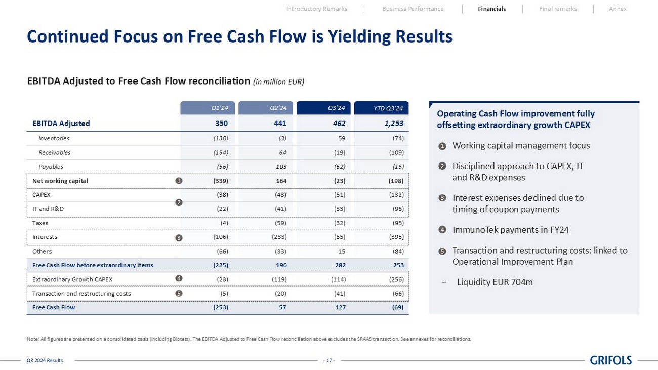 - 16 - Q3 2024 Results 24% 24% 29% 25% 24% 23% 8.0% 13.0% 18.0% 23.0% 28.0% 0 400 800 1200 1600 2000 2019 2020 2021 2022 2023 LTM Q3'24 Opex % revenues Robust Rebound in EBITDA Adjusted Margin and Notable Operational Leverage Momentum Introductory Remarks Business Performance Financials Final remarks Annex 28.6% 27.4% 20.6% 20.2% 22.2% 24.2% -30.0% 0 500 1,000 1,500 2,000 2019 2020 2021 2022 2023 LTM Q3'24 EBITDA Adjusted EBITDA Adjusted Margin EBITDA Adjusted 1 (in million EUR except %) Operational Expenses 2 (in million EUR) Note: All figures are presented on a consolidated basis (including Biotest), and at constant currency (cc), excluding exchang e r ate fluctuations over the period. See annexes for reconciliations. Figures for 2022 have been re - expressed according to the Insi de Information released on July 30, 2024 1 In 2019 and 2020, it corresponds to Underlying EBITDA reported at that time, which also considered certain one - off adjustments; 2 Opex excludes one - offs for the period FY22 - Q3’24, as consistently reported in annexes