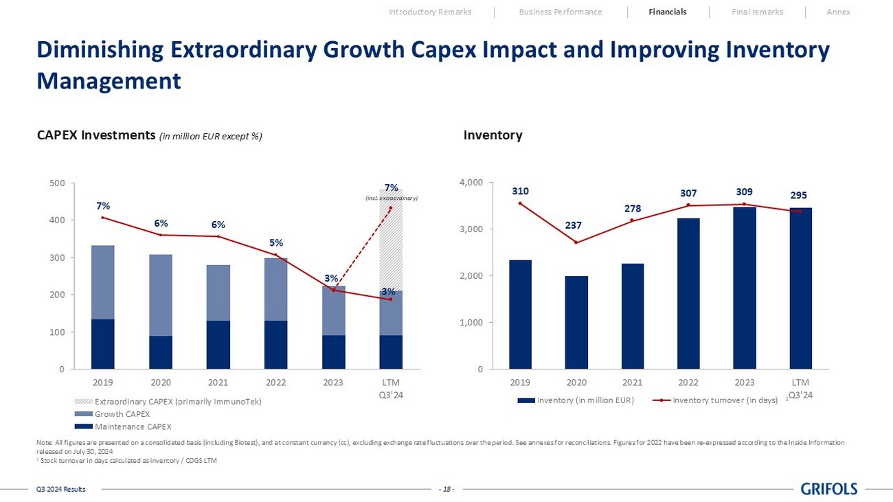 - 17 - Q3 2024 Results YTD Q3’24 Continued Focus on Free Cash Flow is Yielding Results Introductory Remarks Business Performance Financials Final remarks Annex d Q3’24 Q2'24 Q1'24 1,253 462 441 350 EBITDA Adjusted (74) 59 (3) (130) Inventories (109) (19) 64 (154) Receivables (15) (62) 103 (56) Payables (198) (23) 164 (339) Net working capital (132) (51) (43) (38) CAPEX (96) (33) (41) (22) IT and R&D (95) (32) (59) (4) Taxes (395) (55) (233) (106) Interests (84) 15 (33) (66) Others 253 282 196 (225) Free Cash Flow before extraordinary items (256) (114) (119) (23) Extraordinary Growth CAPEX (66) (41) (20) (5) Transaction and restructuring costs (69) 127 57 (253) Free Cash Flow EBITDA Adjusted to Free Cash Flow reconciliation (in million EUR) Operating Cash Flow improvement fully offsetting extraordinary growth CAPEX • Working capital management focus • Disciplined approach to CAPEX, IT and R&D expenses • Interest expenses declined due to timing of coupon payments • ImmunoTek payments in FY24 • Transaction and restructuring costs: linked to Operational Improvement Plan − Liquidity EUR 704m 5 1 2 3 4 5 1 2 3 4 Note: All figures are presented on a consolidated basis (including Biotest). The EBITDA Adjusted to Free Cash Flow reconcilia tio n above excludes the SRAAS transaction. See annexes for reconciliations.