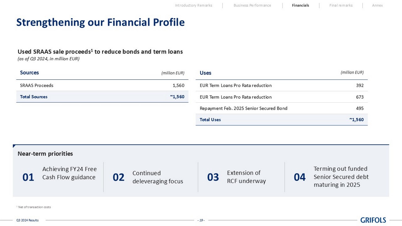- 19 - Q3 2024 Results Strengthening our Financial Profile Introductory Remarks Business Performance Financials Final remarks Annex (million EUR) Sources 1,560 SRAAS Proceeds ~1,560 Total Sources (million EUR) Uses 392 EUR Term Loans Pro Rata reduction 673 EUR Term Loans Pro Rata reduction 495 Repayment Feb. 2025 Senior Secured Bond ~1,560 Total Uses Achieving FY24 Free Cash Flow guidance 01 Continued deleveraging focus 02 Extension of RCF underway 03 Used SRAAS sale proceeds 1 to reduce bonds and term loans (as of Q3 2024, in million EUR) Near - term priorities Terming out funded Senior Secured debt maturing in 2025 04 1 Net of transaction costs