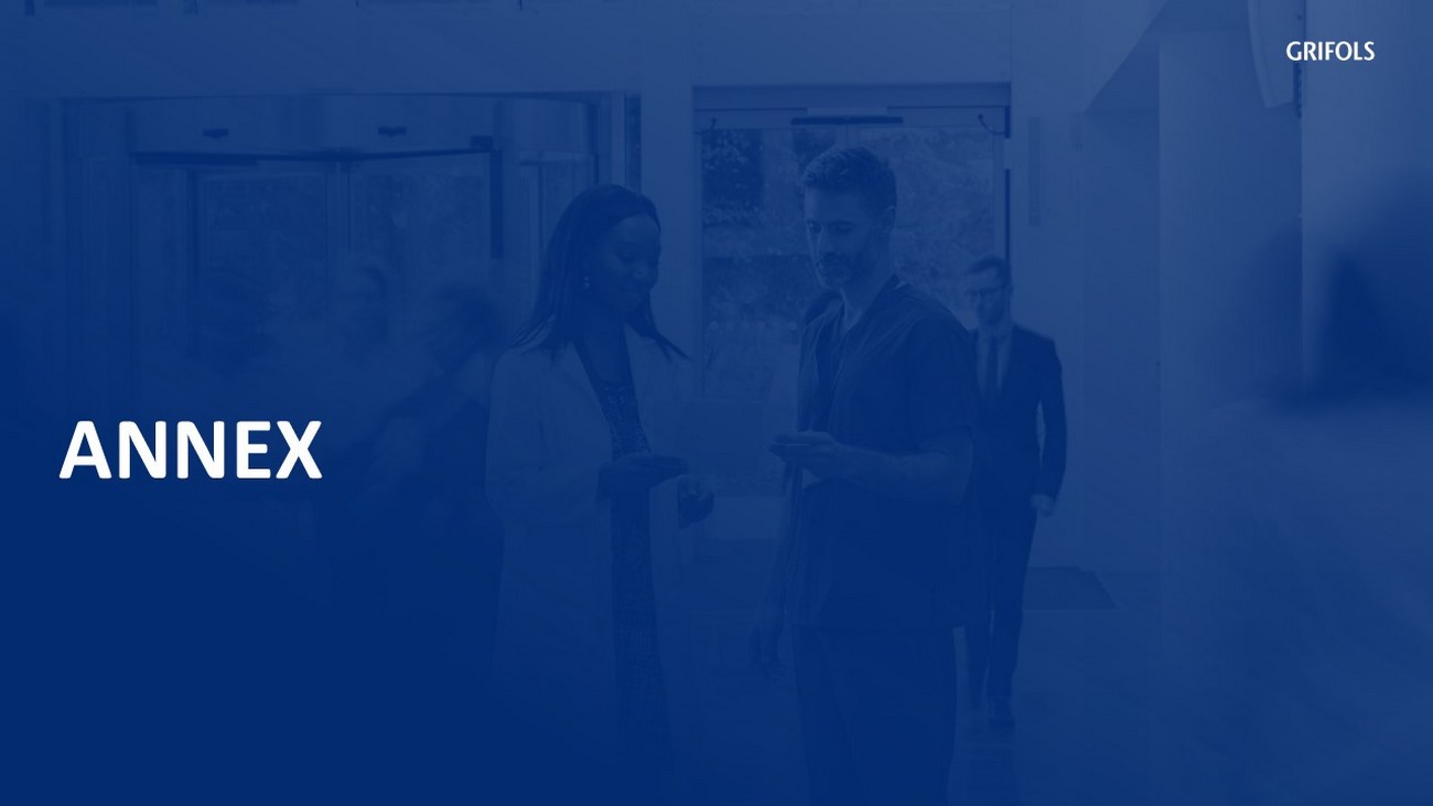This document contains the following Alternative Performance Measures (APMs): Consolidated EBITDA Reported, Consolidated EBITDA Adjusted, Leverage Ratio as per the Credit Facility, Net Debt as per the Credit Facility, Free Cash Flow, Working Capital, and non-recurring items. For further details on the definition, explanation on the use, and reconciliation of APMs, please see the Appendix of the Presentation as well as the “Alternative Performance Measures” document from our website www.grifols.com/en/investors.