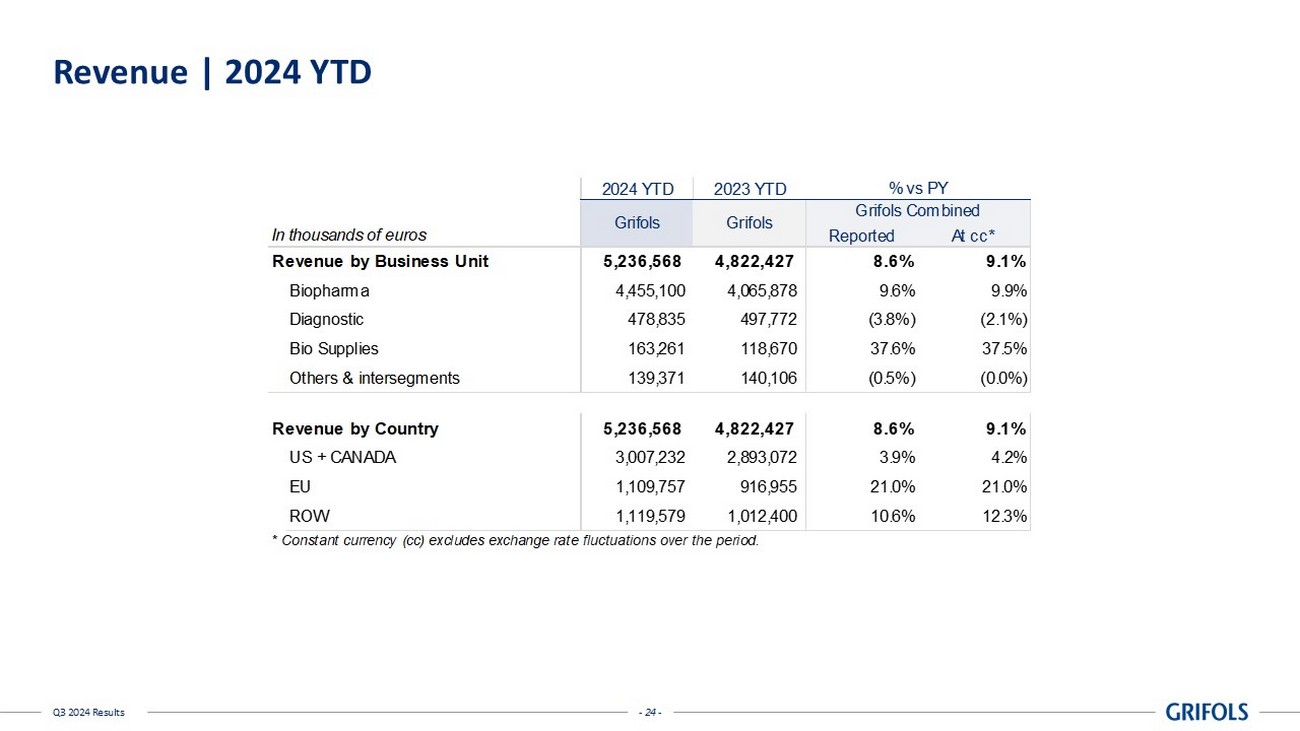 - 24 - Q3 2024 Results Revenue | 2024 YTD 2024 YTD 2023 YTD In thousands of euros Reported At cc* Revenue by Business Unit 5,236,568 4,822,427 8.6% 9.1% Biopharma 4,455,100 4,065,878 9.6% 9.9% Diagnostic 478,835 497,772 (3.8%) (2.1%) Bio Supplies 163,261 118,670 37.6% 37.5% Others & intersegments 139,371 140,106 (0.5%) (0.0%) Revenue by Country 5,236,568 4,822,427 8.6% 9.1% US + CANADA 3,007,232 2,893,072 3.9% 4.2% EU 1,109,757 916,955 21.0% 21.0% ROW 1,119,579 1,012,400 10.6% 12.3% * Constant currency (cc) excludes exchange rate fluctuations over the period. Grifols Grifols Combined Grifols % vs PY