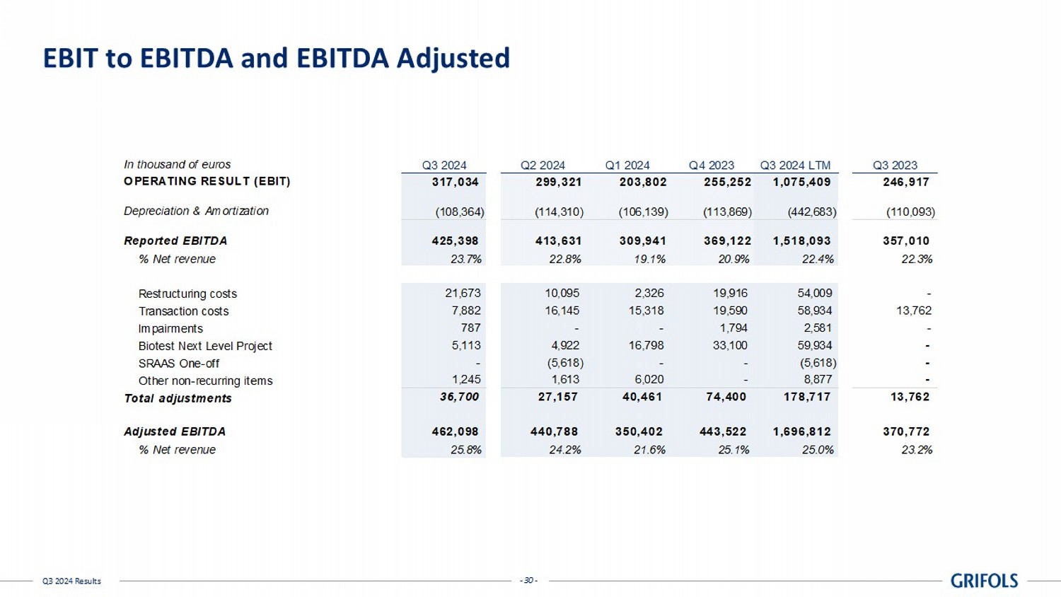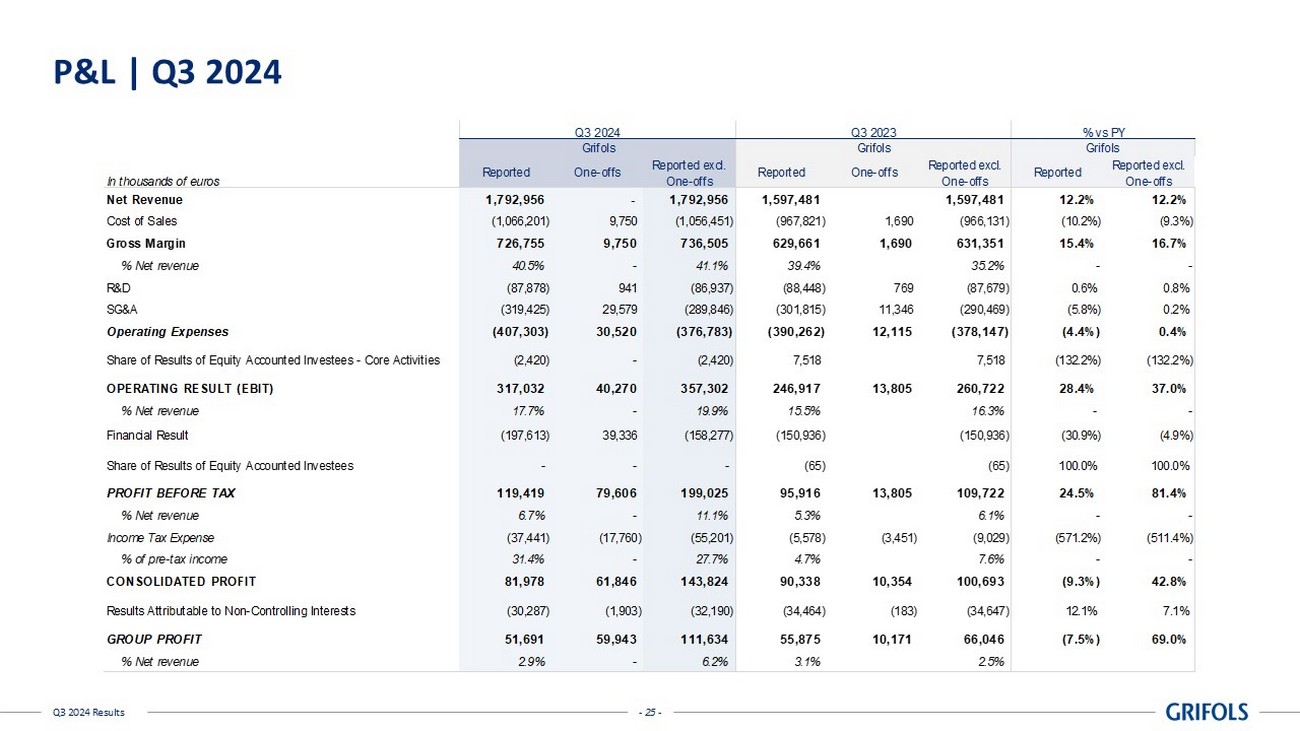 - 26 - Q3 2024 Results P&L | 2024 YTD In thousands of euros Reported One-offs Reported excl. One-offs Reported One-offs Reported excl. One-offs Reported Reported excl. One-offs Net Revenue 5,236,569 - 5,236,569 4,822,427 (18,830) 4,803,597 8.6% 9.0% Cost of Sales (3,208,525) 43,043 (3,165,482) (3,030,663) 28,689 (3,001,974) (5.9%) (5.4%) Gross Margin 2,028,044 43,043 2,071,087 1,791,764 9,859 1,801,623 13.2% 15.0% % Net revenue 38.7% - 39.6% 37.2% 34.4% R&D (269,035) 2,542 (266,493) (281,697) 5,810 (275,887) 4.5% 3.4% SG&A (985,812) 77,241 (908,571) (1,018,049) 133,496 (884,553) 3.2% (2.7%) Operating Expenses (1,254,847) 79,783 (1,175,064) (1,299,746) 139,306 (1,160,440) 3.5% (1.3%) 46,959 (5,618) 41,341 35,047 - 35,047 34.0% 18.0% OPERATING RESULT (EBIT) 820,156 117,208 937,364 527,065 149,165 676,230 55.6% 38.6% % Net revenue 15.7% - 17.9% 10.9% 14.1% Financial Result (586,702) 86,099 (500,603) (425,054) - (425,054) (38.0%) (17.8%) - - - (927) - (927) 100.0% 100.0% PROFIT BEFORE TAX 233,455 203,307 436,761 101,085 149,165 250,251 131.0% 74.5% % Net revenue 4.5% - 8.3% 1.9% 4.8% Income Tax Expense (104,434) (18,662) (123,096) (15,697) (37,317) (53,014) (565.3%) (132.2%) % of pre-tax income 44.7% - 28.2% 6.7% 22.7% CONSOLIDATED PROFIT 129,021 184,645 313,665 85,387 111,848 197,236 51.1% 59.0% Results Attributable to Non-Controlling Interests (41,069) (8,515) (49,584) (99,612) 3,981 (95,631) 58.8% 48.2% GROUP PROFIT 87,952 176,130 264,081 (14,224) 115,829 101,606 718.3% 159.9% % Net revenue 1.7% - 5.0% (0.3%) 2.5% Share of Results of Equity Accounted Investees - Core Activities Share of Results of Equity Accounted Investees Grifols Combined % vs PY Grifols Combined Grifols Combined 2024 YTD 2023 YTD