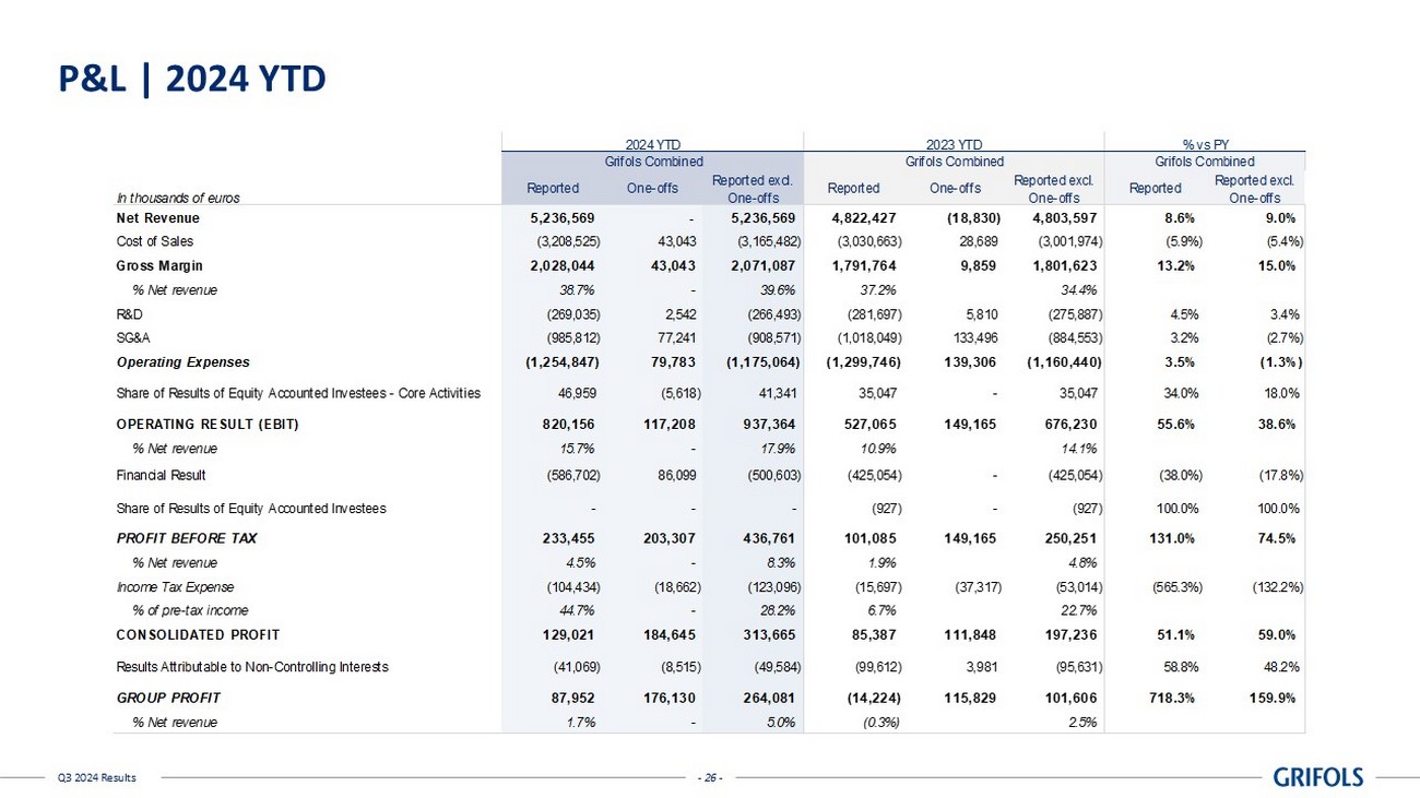 - 25 - Q3 2024 Results P&L | Q3 2024 In thousands of euros Reported One-offs Reported excl. One-offs Reported One-offs Reported excl. One-offs Reported Reported excl. One-offs Net Revenue 1,792,956 - 1,792,956 1,597,481 1,597,481 12.2% 12.2% Cost of Sales (1,066,201) 9,750 (1,056,451) (967,821) 1,690 (966,131) (10.2%) (9.3%) Gross Margin 726,755 9,750 736,505 629,661 1,690 631,351 15.4% 16.7% % Net revenue 40.5% - 41.1% 39.4% 35.2% - - R&D (87,878) 941 (86,937) (88,448) 769 (87,679) 0.6% 0.8% SG&A (319,425) 29,579 (289,846) (301,815) 11,346 (290,469) (5.8%) 0.2% Operating Expenses (407,303) 30,520 (376,783) (390,262) 12,115 (378,147) (4.4%) 0.4% (2,420) - (2,420) 7,518 7,518 (132.2%) (132.2%) OPERATING RESULT (EBIT) 317,032 40,270 357,302 246,917 13,805 260,722 28.4% 37.0% % Net revenue 17.7% - 19.9% 15.5% 16.3% - - Financial Result (197,613) 39,336 (158,277) (150,936) (150,936) (30.9%) (4.9%) - - - (65) (65) 100.0% 100.0% PROFIT BEFORE TAX 119,419 79,606 199,025 95,916 13,805 109,722 24.5% 81.4% % Net revenue 6.7% - 11.1% 5.3% 6.1% - - Income Tax Expense (37,441) (17,760) (55,201) (5,578) (3,451) (9,029) (571.2%) (511.4%) % of pre-tax income 31.4% - 27.7% 4.7% 7.6% - - CONSOLIDATED PROFIT 81,978 61,846 143,824 90,338 10,354 100,693 (9.3%) 42.8% Results Attributable to Non-Controlling Interests (30,287) (1,903) (32,190) (34,464) (183) (34,647) 12.1% 7.1% GROUP PROFIT 51,691 59,943 111,634 55,875 10,171 66,046 (7.5%) 69.0% % Net revenue 2.9% - 6.2% 3.1% 2.5% Q3 2024 % vs PY Share of Results of Equity Accounted Investees Share of Results of Equity Accounted Investees - Core Activities Grifols GrifolsGrifols Q3 2023