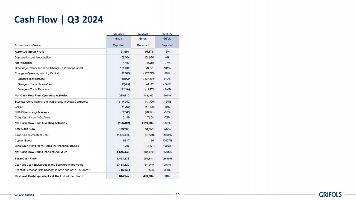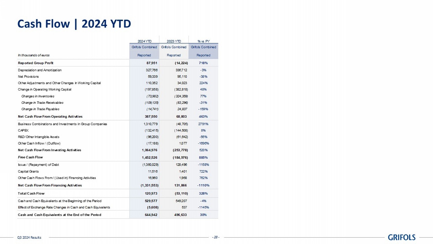 - 27 - Q3 2024 Results Cash Flow | Q3 2024 In thousands of euros Reported Reported Reported Reported Group Profit 51,691 55,875 -7% Depreciation and Amortization 108,364 108,076 0% Net Provisions 4,453 19,269 -77% Other Adjustments and Other Changes in Working Capital 158,008 78,721 101% Change in Operating Working Capital (22,906) (112,779) 80% Changes in Inventories 58,900 (137,134) 143% Change in Trade Receivables (19,466) 44,227 -144% Change in Trade Payables (62,340) (19,871) -214% Net Cash Flow From Operating Activities 299,610 149,163 101% Business Combinations and Investments in Group Companies (114,352) (48,705) -135% CAPEX (51,299) (57,195) 10% R&D/Other Intangible Assets (32,949) (20,971) -57% Other Cash Inflow / (Outflow) 2,199 7,868 -72% Net Cash Flow From Investing Activities (196,401) (119,003) -65% Free Cash Flow 103,209 30,159 242% Issue / (Repayment) of Debt (1,563,615) (81,968) -1808% Capital Grants 5,817 34 16957% Other Cash Flows From / (Used in) Financing Activities 1,350 (137) 1089% Net Cash Flow From Financing Activities (1,556,448) (82,070) -1796% Total Cash Flow (1,453,239) (51,911) -2699% Cash and Cash Equivalents at the Beginning of the Period 2,113,220 541,040 291% Effect of Exchange Rate Changes in Cash and Cash Equivalents (15,039) 7,505 -300% Cash and Cash Equivalents at the End of the Period 644,942 496,634 30% Q3 2024 Q3 2023 % vs PY Grifols Grifols Grifols - 27 -