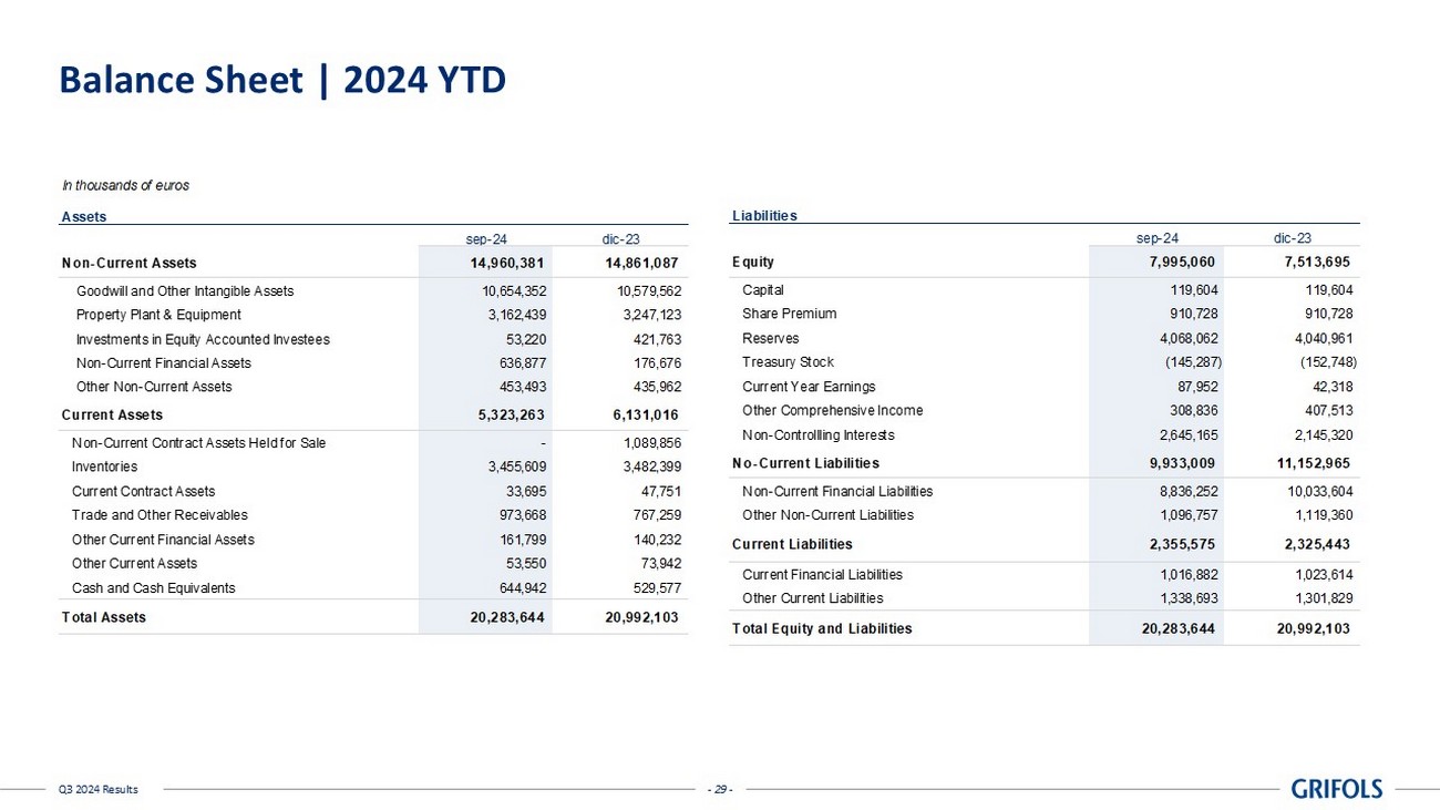 - 28 - Q3 2024 Results Cash Flow | 2024 YTD In thousands of euros Reported Reported Reported Reported Group Profit 87,951 (14,224) 718% Depreciation and Amortization 327,766 336,712 -3% Net Provisions 59,339 95,110 -38% Other Adjustments and Other Changes in Working Capital 110,352 34,023 224% Change in Operating Working Capital (197,858) (382,818) 48% Changes in Inventories (73,982) (324,359) 77% Change in Trade Receivables (109,135) (83,296) -31% Change in Trade Payables (14,741) 24,837 -159% Net Cash Flow From Operating Activities 387,550 68,803 463% Business Combinations and Investments in Group Companies 1,310,779 (48,705) 2791% CAPEX (132,415) (144,508) 8% R&D/Other Intangible Assets (96,200) (61,642) -56% Other Cash Inflow / (Outflow) (17,188) 1,077 -1696% Net Cash Flow From Investing Activities 1,064,976 (253,778) 520% Free Cash Flow 1,452,526 (184,976) 885% Issue / (Repayment) of Debt (1,360,029) 128,496 -1158% Capital Grants 11,516 1,401 722% Other Cash Flows From / (Used in) Financing Activities 16,960 1,968 762% Net Cash Flow From Financing Activities (1,331,553) 131,866 -1110% Total Cash Flow 120,973 (53,110) 328% Cash and Cash Equivalents at the Beginning of the Period 529,577 549,207 -4% Effect of Exchange Rate Changes in Cash and Cash Equivalents (5,608) 537 -1145% Cash and Cash Equivalents at the End of the Period 644,942 496,633 30% Grifols Combined % vs PY Grifols Combined 2024 YTD Grifols Combined 2023 YTD - 28 -