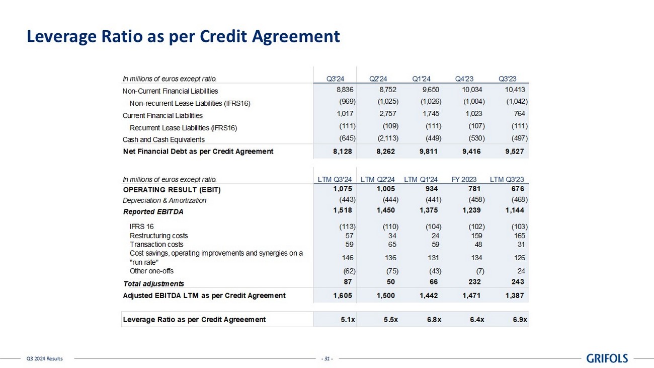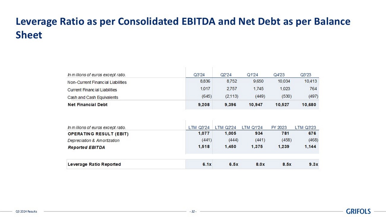 - 31 - Q3 2024 Results Leverage Ratio as per Credit Agreement In millions of euros except ratio. Q3'24 Q2'24 Q1'24 Q4'23 Q3'23 Non-Current Financial Liabilities 8,836 8,752 9,650 10,034 10,413 Non-recurrent Lease Liabilities (IFRS16) (969) (1,025) (1,026) (1,004) (1,042) Current Financial Liabilities 1,017 2,757 1,745 1,023 764 Recurrent Lease Liabilities (IFRS16) (111) (109) (111) (107) (111) Cash and Cash Equivalents (645) (2,113) (449) (530) (497) Net Financial Debt as per Credit Agreement 8,128 8,262 9,811 9,416 9,527 In millions of euros except ratio. LTM Q3'24 LTM Q2'24 LTM Q1'24 FY 2023 LTM Q3'23 OPERATING RESULT (EBIT) 1,075 1,005 934 781 676 Depreciation & Amortization (443) (444) (441) (458) (468) Reported EBITDA 1,518 1,450 1,375 1,239 1,144 IFRS 16 (113) (110) (104) (102) (103) Restructuring costs 57 34 24 159 165 Transaction costs 59 65 59 48 31 Cost savings, operating improvements and synergies on a "run rate" 146 136 131 134 126 Other one-offs (62) (75) (43) (7) 24 Total adjustments 87 50 66 232 243 Adjusted EBITDA LTM as per Credit Agreement 1,605 1,500 1,442 1,471 1,387 Leverage Ratio as per Credit Agreeement 5.1x 5.5x 6.8x 6.4x 6.9x
