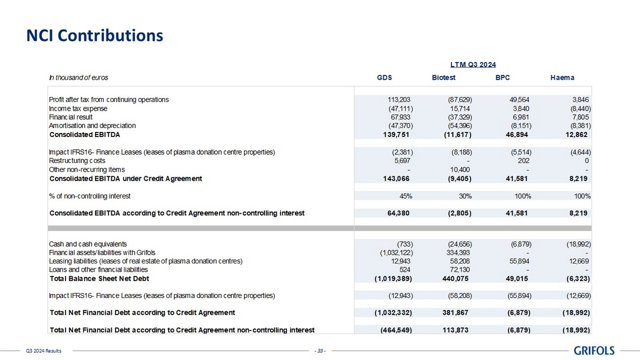 - 33 - Q3 2024 Results NCI Contributions In thousand of euros GDS Biotest BPC Haema Profit after tax from continuing operations 113,203 (87,629) 49,564 3,846 Income tax expense (47,111) 15,714 3,840 (8,440) Financial result 67,933 (37,329) 6,981 7,805 Amortisation and depreciation (47,370) (54,396) (8,151) (8,381) Consolidated EBITDA 139,751 (11,617) 46,894 12,862 Impact IFRS16- Finance Leases (leases of plasma donation centre properties) (2,381) (8,188) (5,514) (4,644) Restructuring costs 5,697 - 202 0 Other non-recurring items - 10,400 - - Consolidated EBITDA under Credit Agreement 143,066 (9,405) 41,581 8,219 % of non-controlling interest 45% 30% 100% 100% Consolidated EBITDA according to Credit Agreement non-controlling interest 64,380 (2,805) 41,581 8,219 Cash and cash equivalents (733) (24,656) (6,879) (18,992) Financial assets/liabilities with Grifols (1,032,122) 334,393 - - Leasing liabilities (leases of real estate of plasma donation centres) 12,943 58,208 55,894 12,669 Loans and other financial liabilities 524 72,130 - - Total Balance Sheet Net Debt (1,019,389) 440,075 49,015 (6,323) Impact IFRS16- Finance Leases (leases of plasma donation centre properties) (12,943) (58,208) (55,894) (12,669) Total Net Financial Debt according to Credit Agreement (1,032,332) 381,867 (6,879) (18,992) Total Net Financial Debt according to Credit Agreement non-controlling interest (464,549) 113,873 (6,879) (18,992) LTM Q3 2024