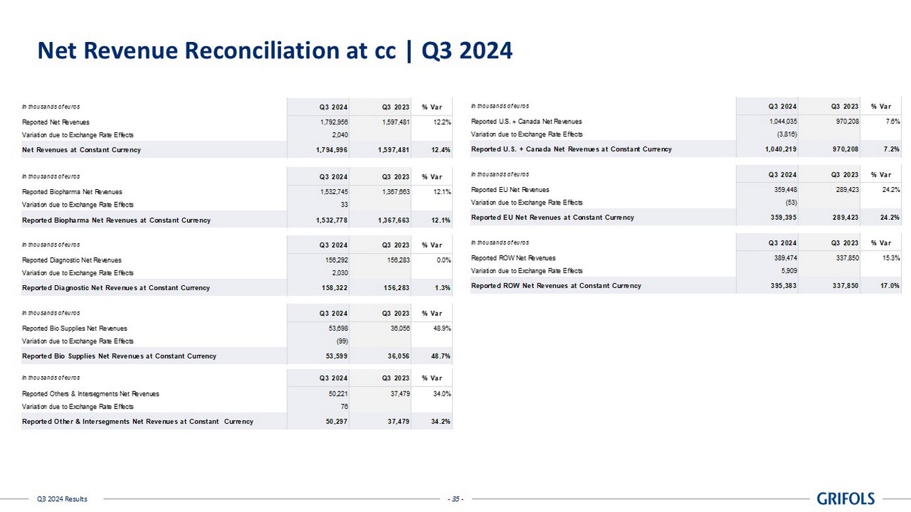 - 23 - Q3 2024 Results Revenue | Q3 2024 Q3 2024 Q3 2023 In thousands of euros Reported At cc* Revenue by Business Unit 1,792,956 1,597,481 12.2% 12.4% Biopharma 1,532,745 1,367,663 12.1% 12.1% Diagnostic 156,292 156,283 0.0% 1.3% Bio Supplies 53,698 36,056 48.9% 48.7% Others & intersegments 50,221 37,479 34.0% 34.2% Revenue by Country 1,792,956 1,597,481 12.2% 12.4% US + CANADA 1,044,035 970,208 7.6% 7.2% EU 359,448 289,423 24.2% 24.2% ROW 389,474 337,850 15.3% 17.0% * Constant currency (cc) excludes exchange rate fluctuations over the period. Grifols Grifols Grifols % vs PY