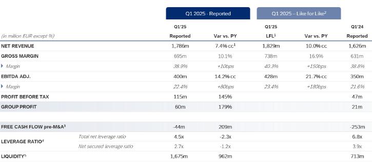 ·Adjusted EBITDA increases to EUR 400 million (+14.2% cc and +21.7% cc LFL), with a margin of 22.4%. Reported EBITDA grows by 22.6% cc to EUR 381 million.